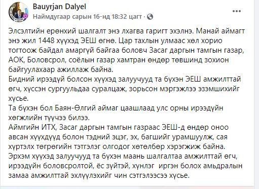 Энэ талаар Баян-Өлгий аймгийн Засаг дарга Д.Бауыржан өөрийн цахим хуудаснаа  "Элсэлтийн ерөнхий шалгалт энэ лхагва гарагт эхэлнэ. Манай аймагт энэ жил 1448 хүүхэд ЭЕШ өгнө. Цар тахлын улмаас хөл  хорио тогтоож байдал амаргүй байгаа боловч Засаг даргын тамгын газар, АОК, Боловсрол, соёлын газар хамтран өндөр төвшинд зохион байгуулахаар ажиллаж байна. Бидний ирээдүй болсон хүүхэд залуучууд та бүхэн ЭЕШ амжилттай өгч, хүссэн сургуульдаа суралцаж, зорьсон мэргэжлээ эзэмшихийг хүсье. Та бүхэн бол Баян-Өлгий аймаг цаашлаад улс орны ирээдүйн хөгжлийн түүчээ билээ. Аймгийн ИТХ, Засаг даргын тамгын газраас ЭЕШ-д өндөр оноо авсан хүүхдүүд болон тэдний эцэг, эх багшийг урамшуулж, сая хүртэлх төгрөгийн тэтгэлэг олгодог хөтөлбөр хэрэгжиж байна. Эрхэм хүүхэд залуучууд та бүхэн маань шалгалтаа амжилттай өгч, ирээдүйн боловсролтой, ёс зүйтэй, хүнлэг иргэн болох амьдралын замаа амжилттай эхлүүлэхийг чин сэтгэлээсээ хүсье" гэж бичжээ.