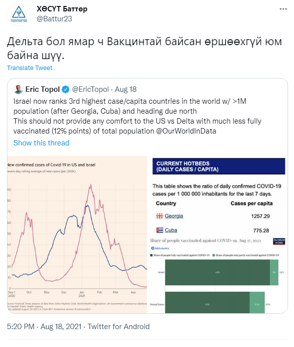 Манай улсад "Дельта" хувилбар илүү тархаж буйтай холбоотойгоор вакцинжуулалтын гуравдугаар тунг хийж эхэлсэн. Тэгвэл "Дельта" хувилбар болон вакцины үйлчлэлийн талаар ХӨСҮТ-ийн ерөнхий захирал Л.Баттөр өөрийн цахим хуудаснаа бичжээ. Тэрбээр, "Дельта" бол ямар ч вакцинтай байсан өршөөхгүй юм байна шүү" гэжээ.