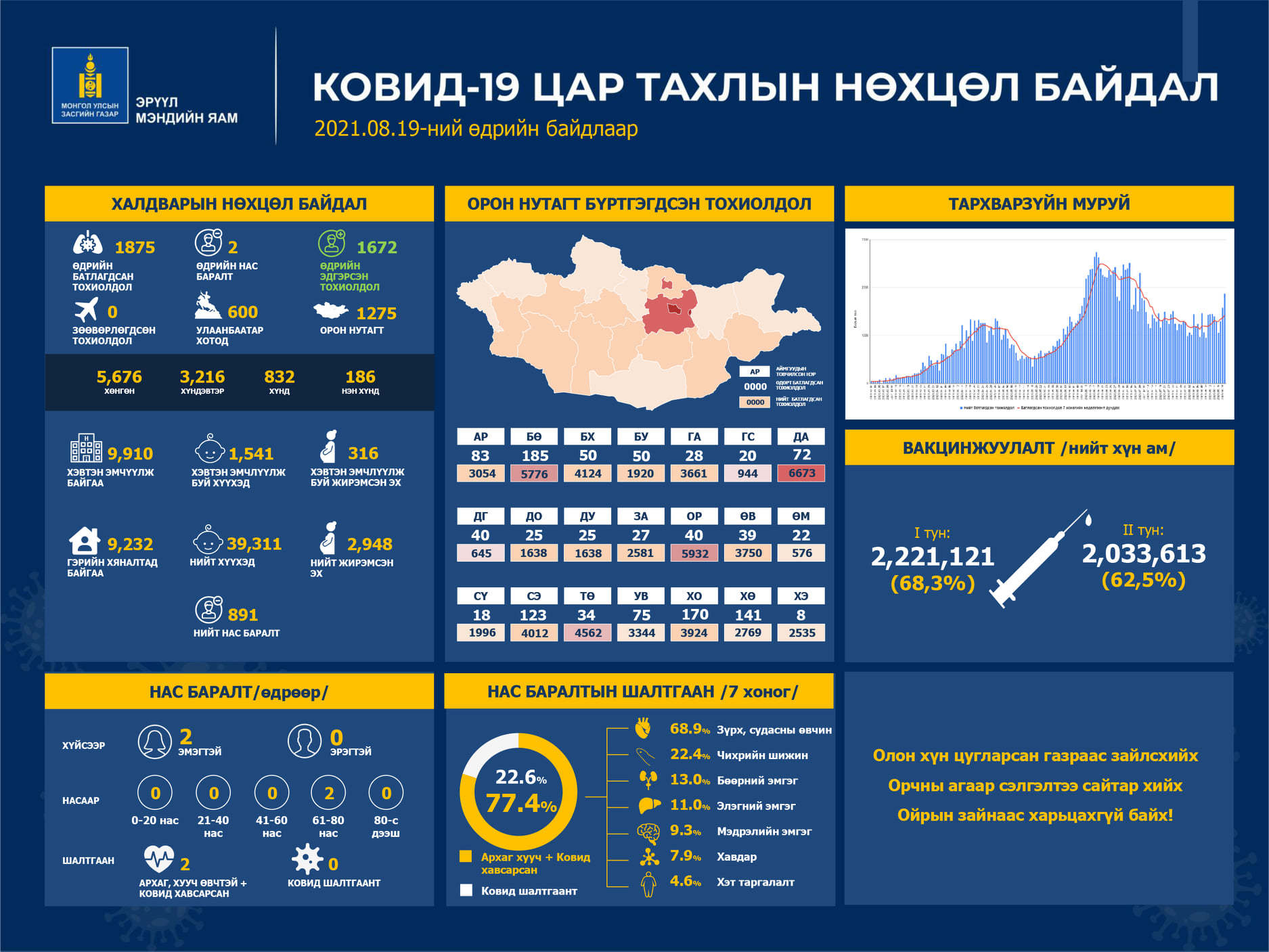 Өнөөдрийн байдлаар 9 910 хүн эмчилгээнд байгаа. Биеийн байдлыг үнэлбэл, 5 676 хүн хөнгөн, 3 216 хүндэвтэр, хүнд 832, маш хүнд 186 хүн байна.