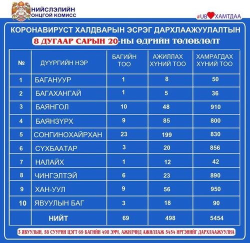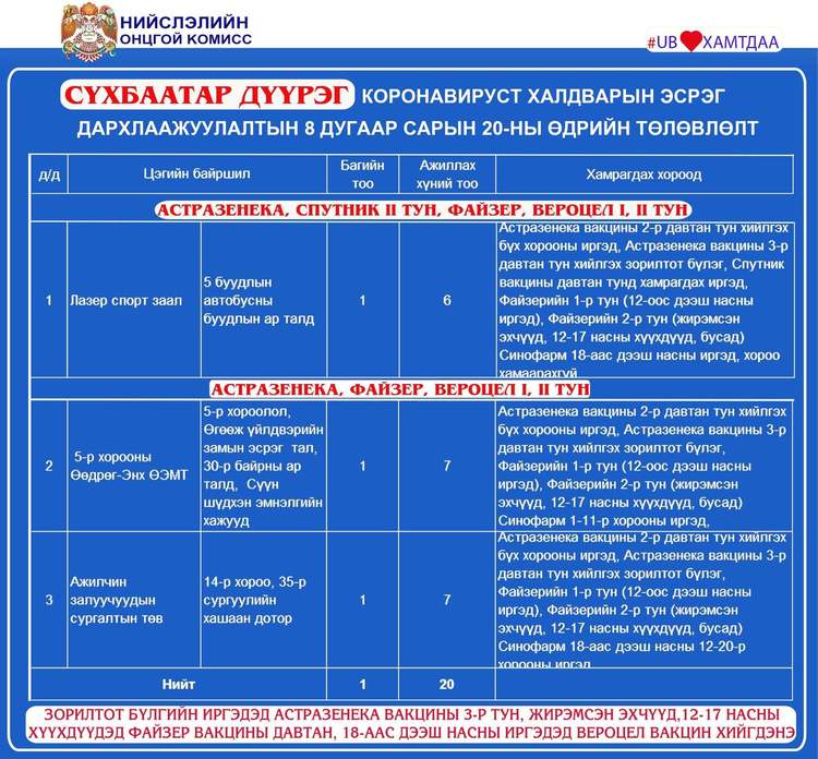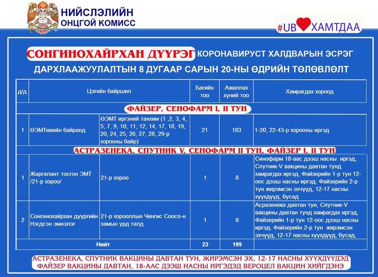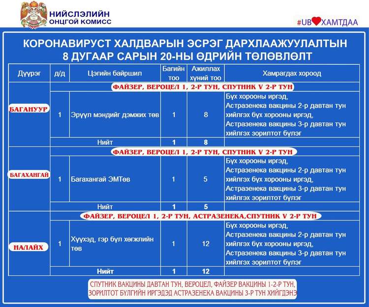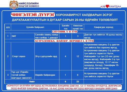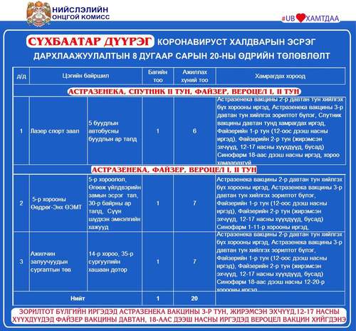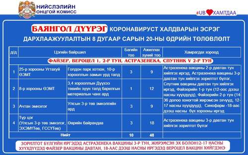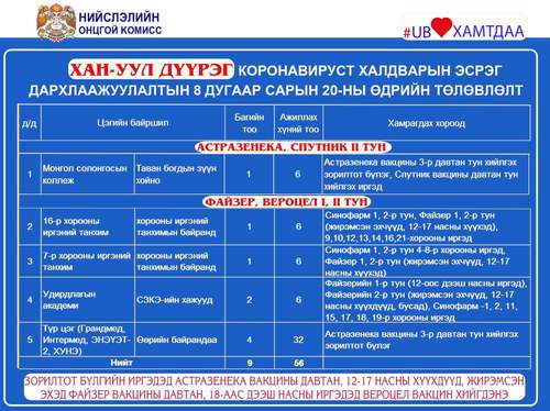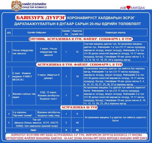 Өнөөдөр Улаанбаатар хотод явуулын 3, суурин 58 цэгт 69 багийн 498 эмч, ажилтан ажиллана. Нийт 5454 иргэнийг дархлаажуулахаар төлөвлөөд байна. Дархлаажуулалтын цэгийг дүүрэг тус бүрээр нь танилцуулж байна.