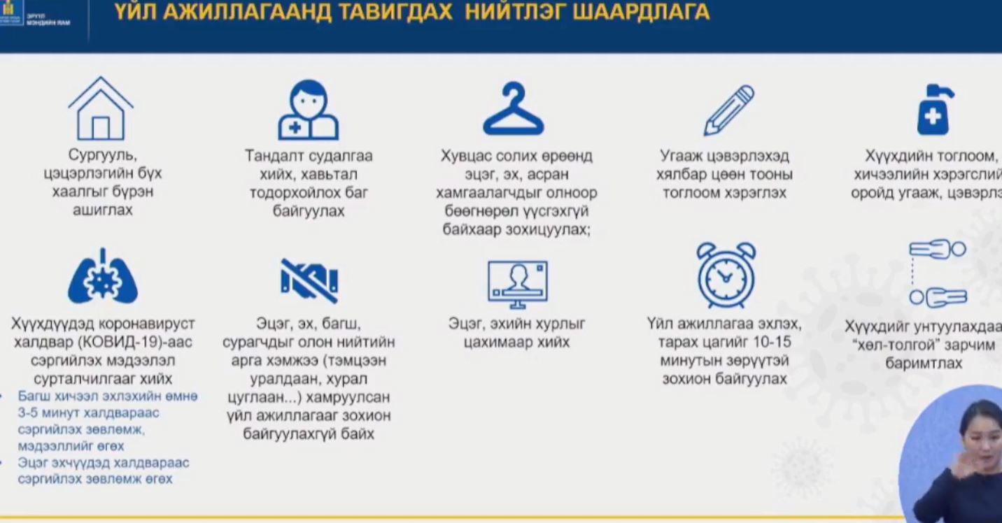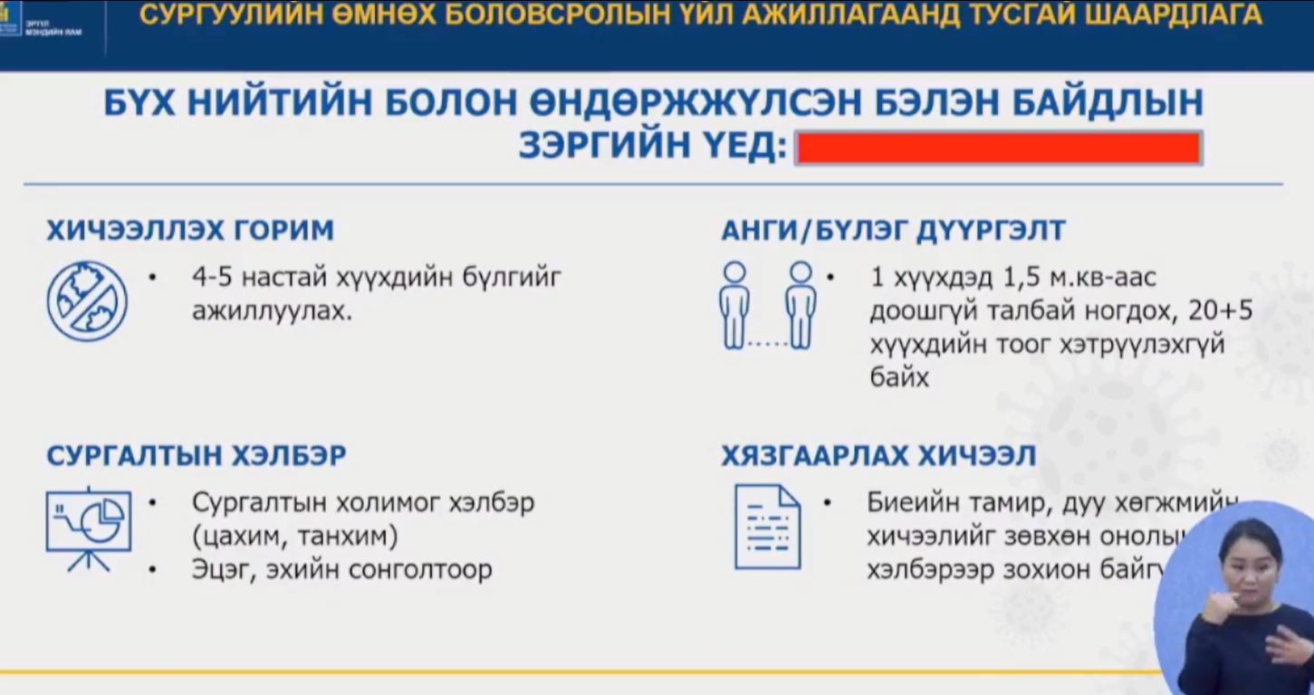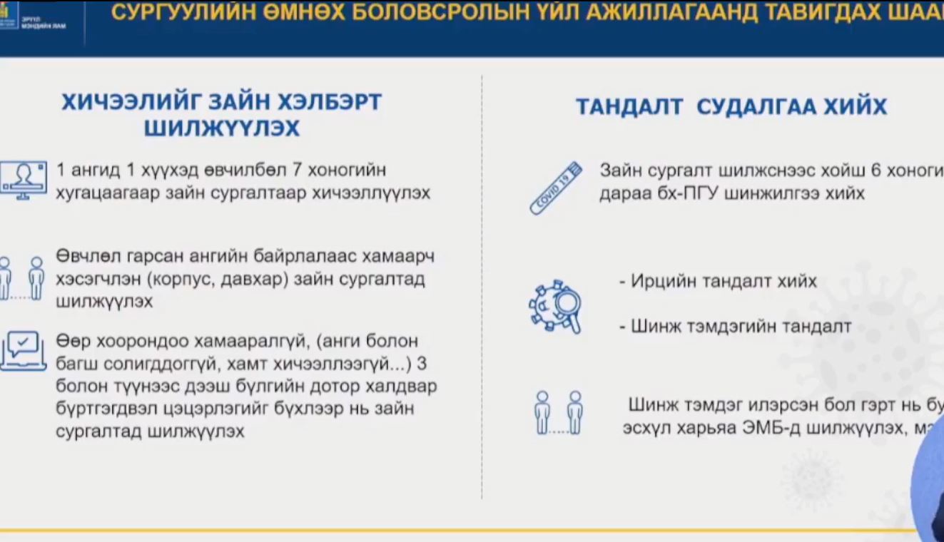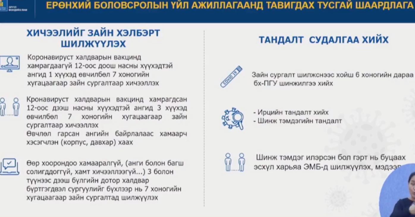 Өөр хоорондоо хамааралгүй гурав болон түүнээс дээш бүлгийн дотор халдвар бүртгэгдвэл сургуулийг бүхлээр нь долоо хоногийн хугацаагаар зайн сургалтад шилжүүлэх" гэж мэдээллээ.