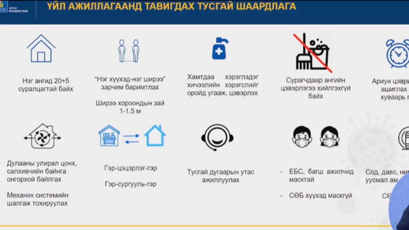 ЭМЯ-ны Хэлтсийн дарга Д.Баярболд "Есдүгээр сарын 01-нээс эхэлж сургалтын байгууллагуудын үйл ажиллагааг эхлүүлэх шийдвэрийг Засгийн газраас гаргасан. Уг шийдвэртэй холбоотойгоор БШУ-ны сайд, Эрүүл мэндийн сайдын тушаалаар сургууль цэцэрлэгийн үйл ажиллагаанд мөрдөгдөх дүрэм, зааврыг гаргаж батлуулсан.