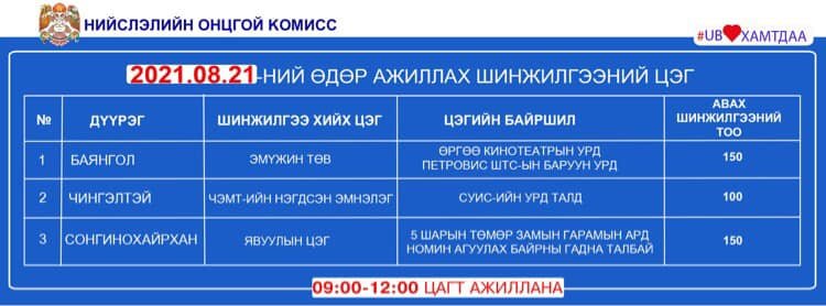 Өнөөдөр ажиллах шинжилгээний цэгийн байршил