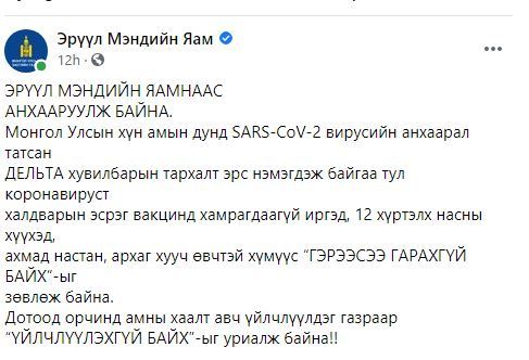 Коронавирусийн халдвар буурахгүй нэмэгдэж байгаа. Монгол Улсын хүн амын дунд SARS-CoV-2 вирусийн анхаарал татсан Дельта хувилбарын тархалт эрс нэмэгдэж байгаа тул коронавируст халдварын эсрэг вакцинд хамрагдаагүй иргэд, 12 хүртэлх насны хүүхэд, ахмад настан, архаг хууч өвчтэй хүмүүс гэрээсээ гарахгүй байхыг ЭМЯ-наас зөвлөж байна.