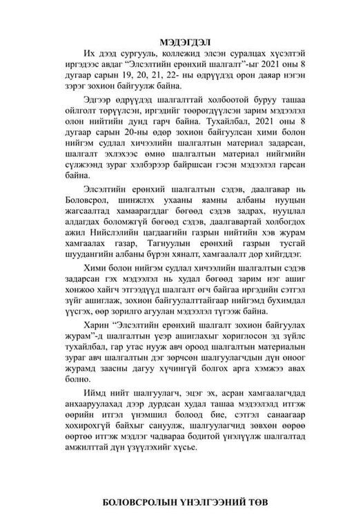 Хими болон нийгэм судлал хичээлийн шалгалтын сэдэв задарсан гэх мэдээлэл нь худал бөгөөд зарим нэг ашиг хонжоо хайгч этгээдүүд шалгалт өгч байгаа иргэдийн сэтгэл зүйг ашиглаж, зохион байгуулалттайгаар нийгэмд бухимдал үүсгэх, өөр зорилго агуулан мэдээлэл түгээж байна.