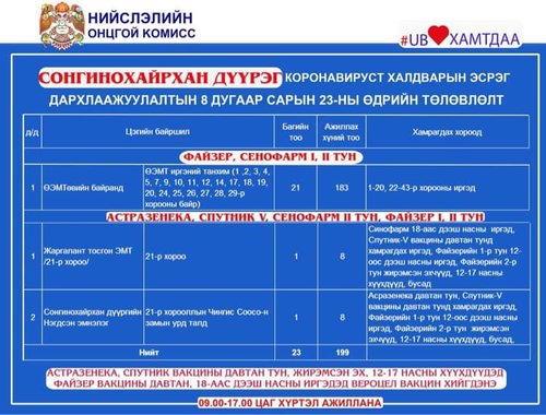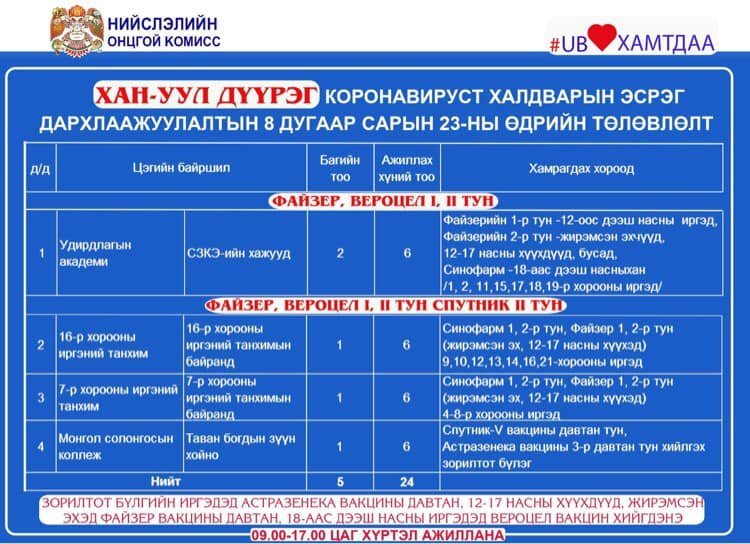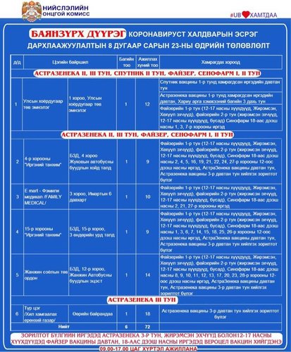 Өнөөдөр Улаанбаатар хотод явуулын 2, суурин 46 цэгт 59 багийн 403 эмч, ажилтан ажиллаж, 4848 иргэнийг дархлаажуулахаар төлөвлөжээ. Дархлаажуулалтын цэгийг дүүрэг тус бүрээр танилцуулж байна.