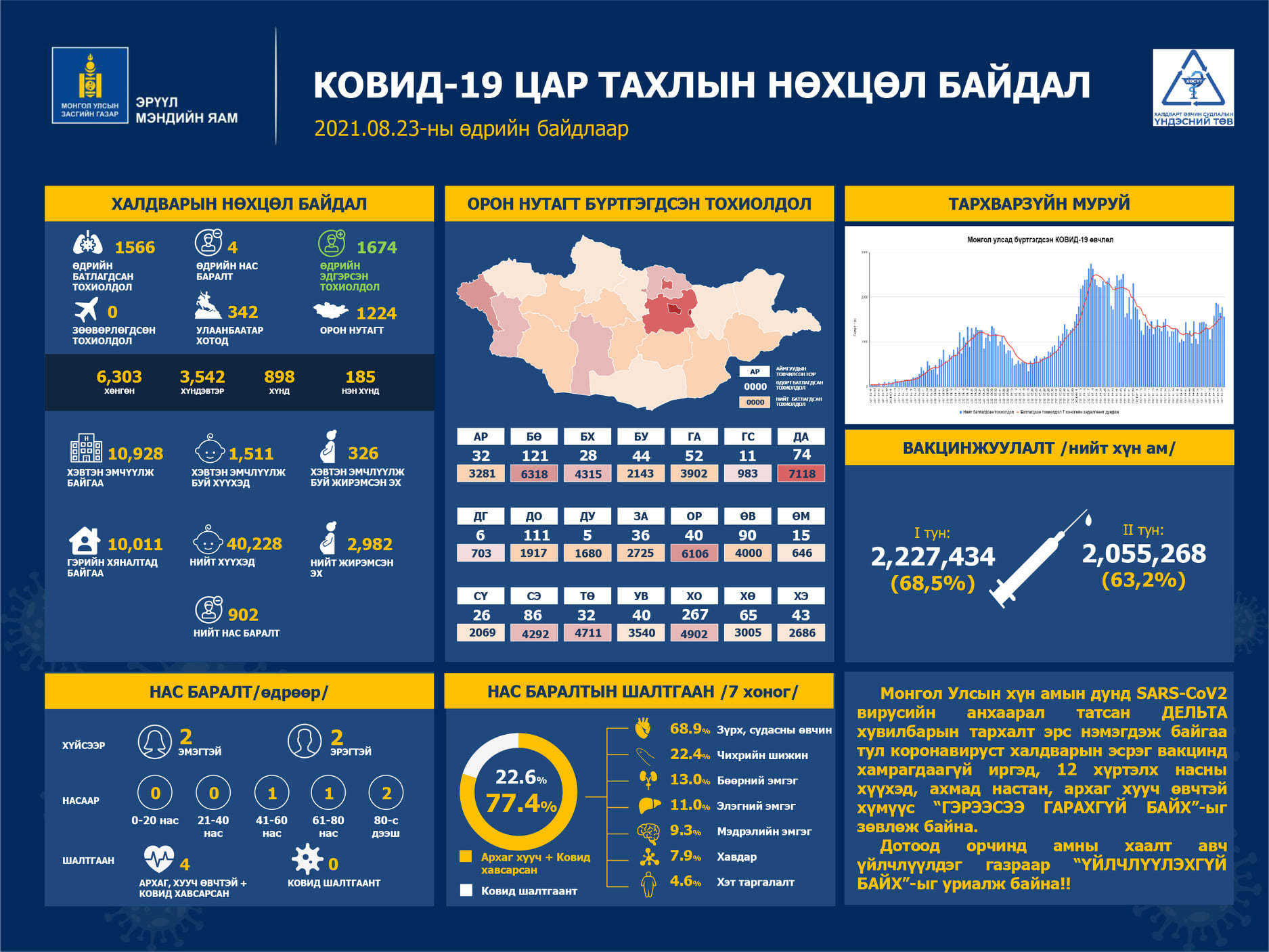 ЭМЯ-наас коронавирусийн халдварын нөхцөл байдлын мэдээллийг гаргажээ. Энэ өдөр шинээр 1566 тохиолдол бүртгэгджээ. Шинээр батлагдсан тохиолдлын 342 нь Улаанбаатар хотод, 1224 нь орон нутагт, байна. Мөн хугацаанд халдварын улмаас дөрвөн хүн нас баржээ. Түүнчлэн сүүлийн 24 цагийн хугацаанд 1674 хүн эдгэрлээ.