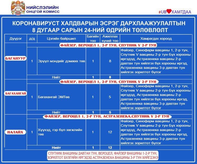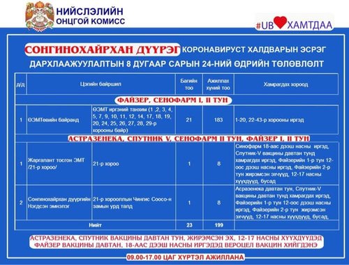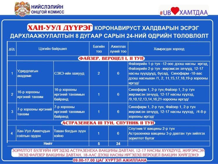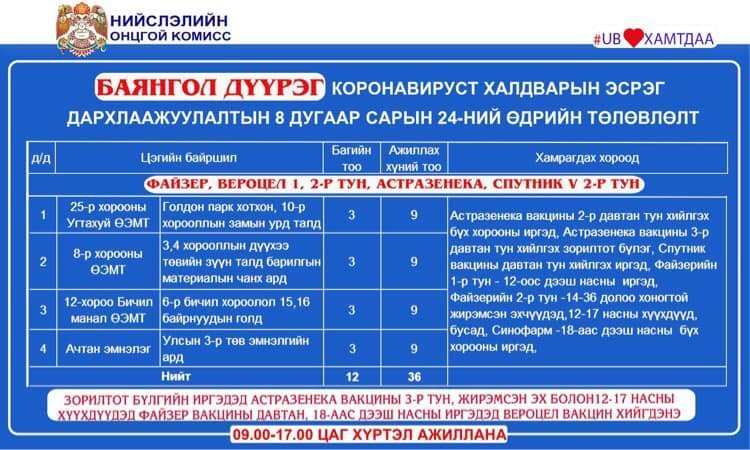 Өнөөдөр Улаанбаатар хотод явуулын 2, суурин 44 цэгт 58 багийн 3853 эмч, ажилтан ажиллаж, 5328 иргэнийг дархлаажуулахаар төлөвлөлөө. Дархлаажуулалтын цэгийг дүүрэг тус бүрээр танилцуулж байна.