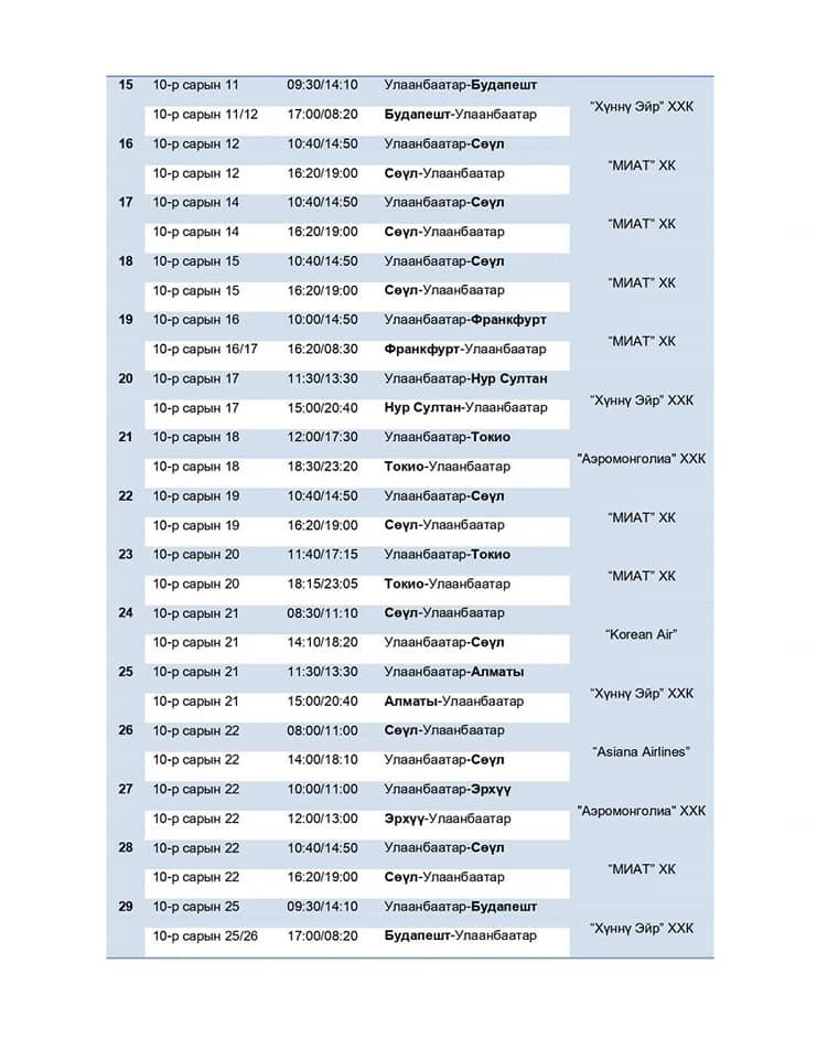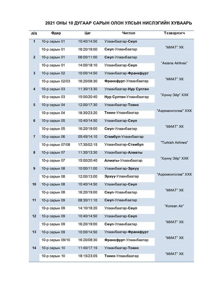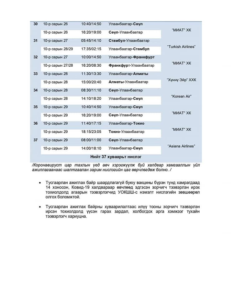 ИНЕГ-аас аравдугаар сарын нислэгийн хуваарийг танилцуулж байна. Аравдугаар сард нийт 37 тусгай үүргийн нислэг үйлдэхээр төлөвлөжээ. Ингэхдээ тусгаарлан ажиглах байр шаардлагагүй буюу вакцины бүрэн тунд хамрагдаад 14 хоносон, коронавирусийн халдвараар өвчлөөд эдгэсэн зорчигч тээвэрлэн ирэх тохиолдолд агаарын тээвэрлэгчид УОКШШ-с нэмэлт нислэгийн зөвшөөрөлө олгох боломжтой.