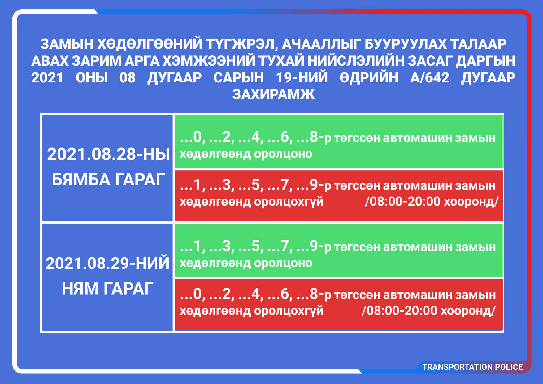 Энэ сарын 19-ны өдрийн А/642 дугаартай захирамжийн дагуу энэ сарын 28,29 нд тэгш сондгой буюу дугаарын хязгаарлалттай хөдөлгөөнд оролцуулах юм байна.
