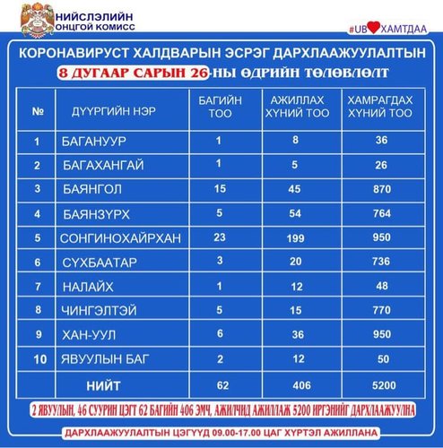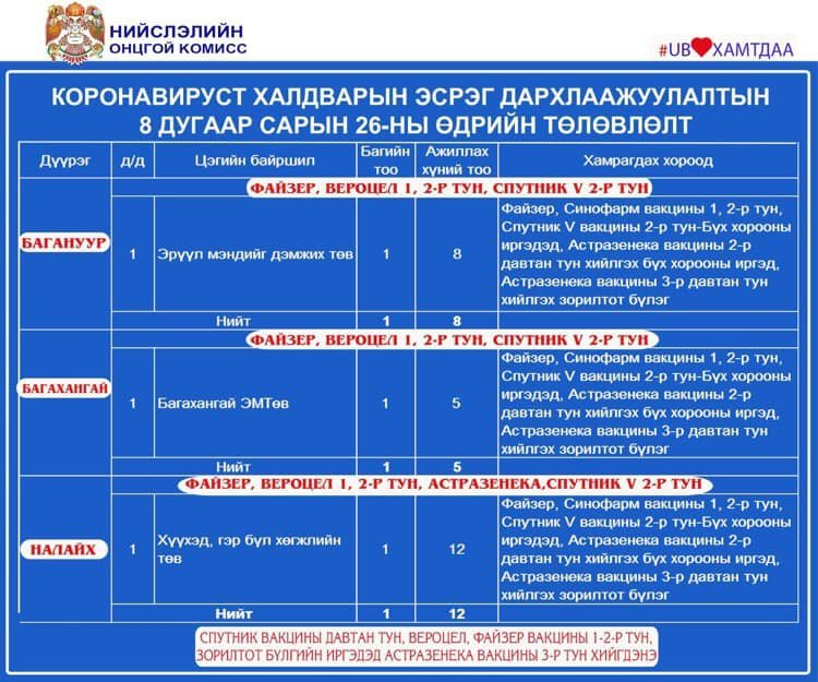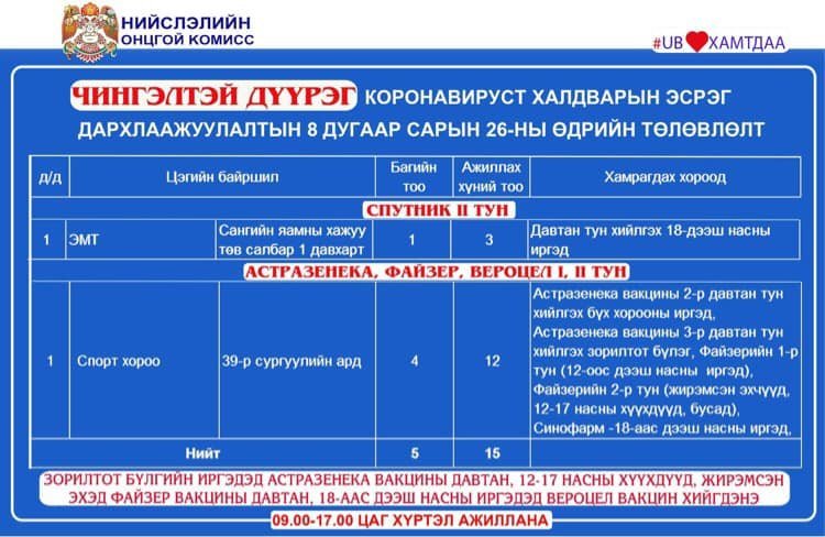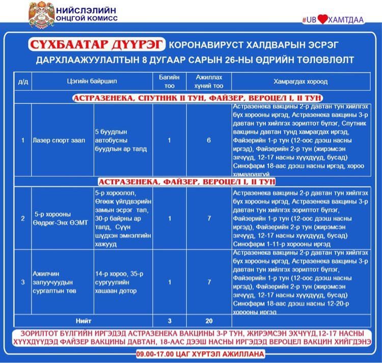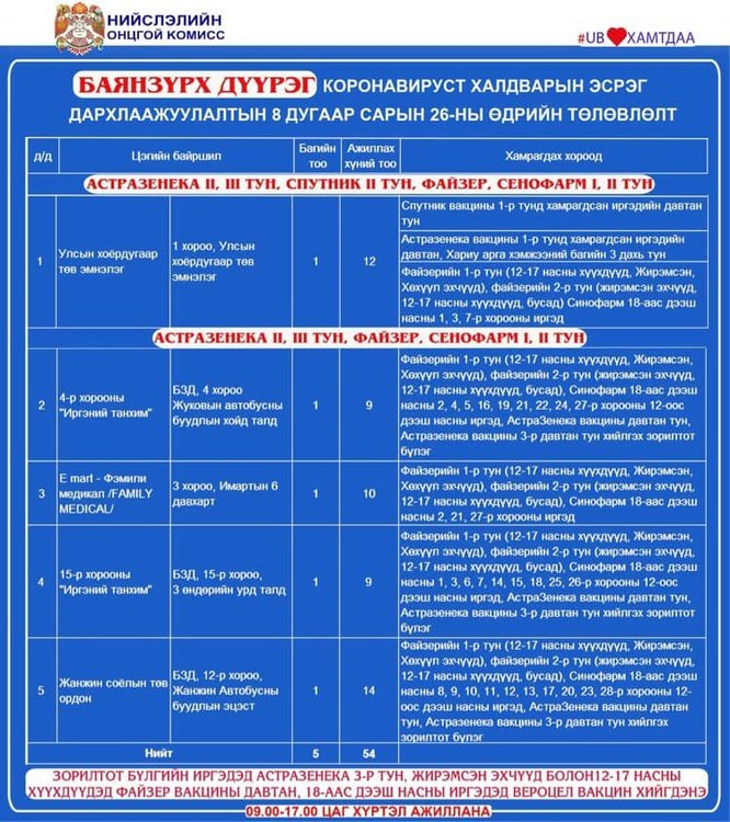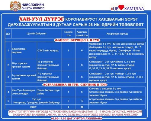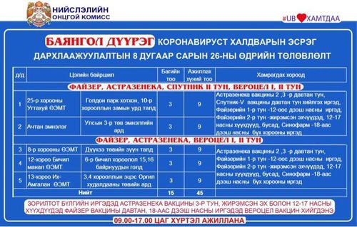 Өнөөдөр буюу 2021 оны 08 дугаар сарын 26-нд Улаанбаатар хотод явуулын 2, суурин 46 цэгт 62 багийн 406 эмч, ажилтан ажиллаж, 5200 иргэнийг дархлаажуулахаар төлөвлөлөө. Дархлаажуулалтын цэгийг дүүрэг тус бүрээр танилцуулж байна.