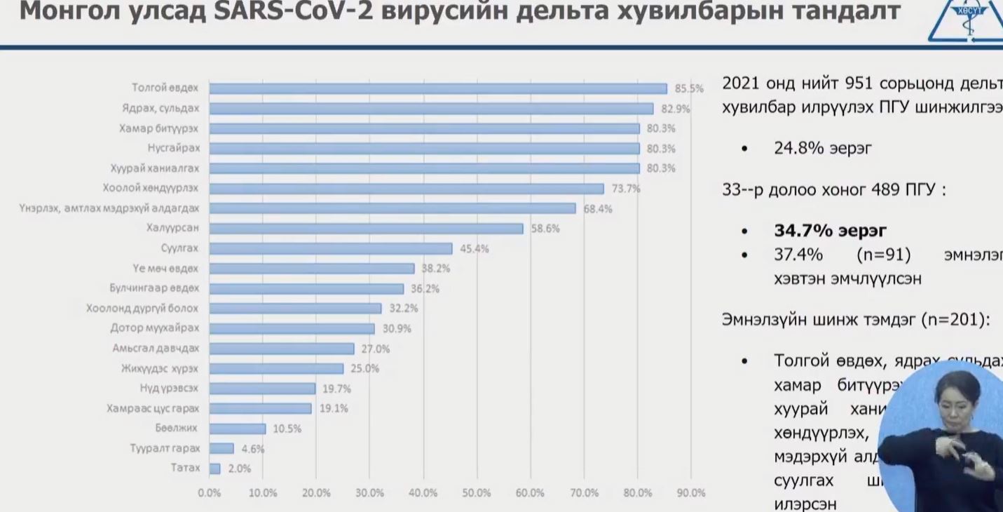ХӨСҮТ-ийн дэд захирал Ж.Байгалмаа "Коронавирусийн зургадугаар сарын давлагаа долдугаар сарын эхээр буурсан. Гэсэн хэдий ч наймдугаар сарын эхээр эргэн нэмэгдсэн. Шинжилгээнд эерэг эзлэх хувь нь тухайн халдварын тархалтыг илэрхийлдэг үзүүлэлт юм. Улаанбаатарт хотод зургадугаар сард шинжилгээнд эерэг эзлэх нь 30 хувьтай байсан. Харин долоо, наймдугаар сарын дунд үед 10 орчим хувьтай болж ирсэн. Өөрөөр хэлбэл өвчлөлийн тархалт маш сайн буурсан.