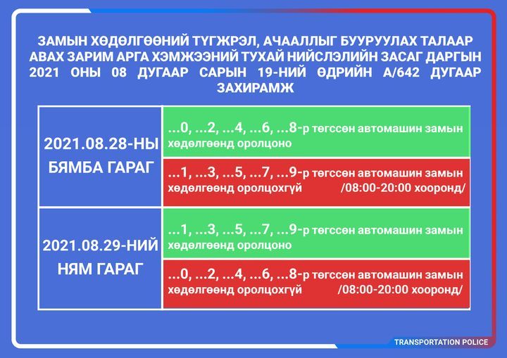 Өнөөдөр буюу наймдугаар сарын 28, 29-н жолооч нар хөдөлгөөнд оролцохдоо автомашины улсын дугаарын тэгш, сондгойгоор зорчуулах зохицуулалт үйлчилж байна. Тодруулбал, өнөөдөр буюу бямба гарагт автомашины улсын дугаарын сүүлчийн орон нь тэгш, маргааш буюу ням гарагт сондгой тоогоор төгссөн тээврийн хэрэгслийг 08:00-20:00 цагийн хооронд замын хөдөлгөөнд оролцуулна. Дугаарын хязгаарлалт нь Саппорогийн уулзвараас Офицеруудын ордон, 32-ын тойргоос 120-ын уулзвар хүртэл үйлчилнэ.