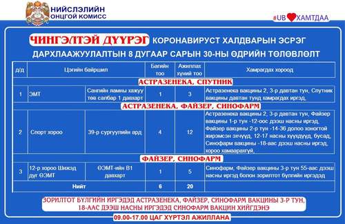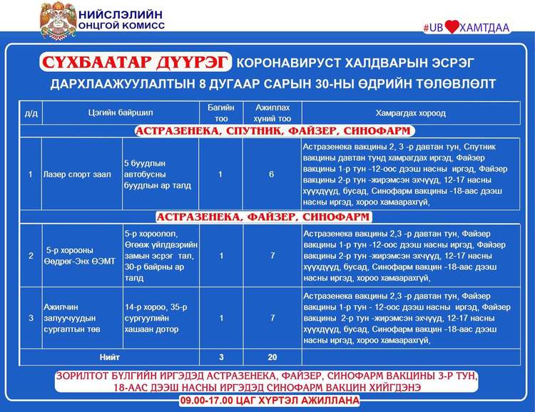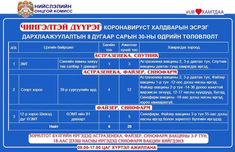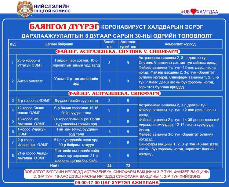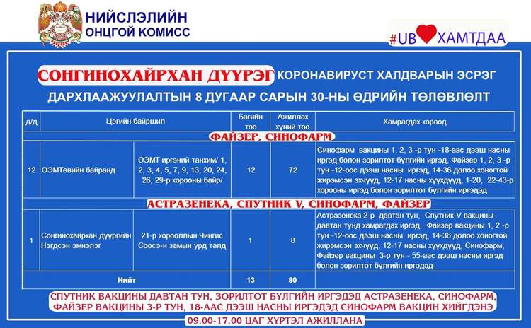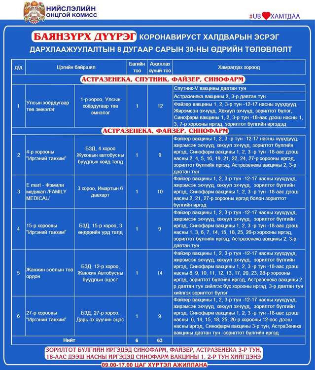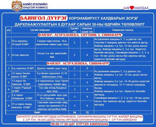 Өнөөдөр Улаанбаатар хотод явуулын 4, суурин 44 цэгт 65 багийн 336 эмч, ажилтан ажиллаж, 6220 иргэнийг дархлаажуулахаар төлөвлөлөө. Дархлаажуулалтын цэгүүдийг дүүрэг тус бүрээр танилцуулж байна.