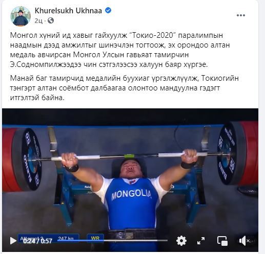 Тэрбээр, "Монгол хүний их хавыг гайхуулж "Токио-2020" паралимпын наадмын дээд амжилтыг шинэчлэн тогтоож, эх орондоо алтан медаль авчирсан Монгол Улсын гавьяат тамирчин Э.Содномпилжээдээ чин сэтгэлээсээ халуун баяр хүргэе. Манай баг тамирчид медалийн буухиаг үргэлжлүүлж, Токиогийн тэнгэрт алтан соёмбот далбаагаа олонтоо мандуулна гэдэгт итгэлтэй байна" гэжээ.