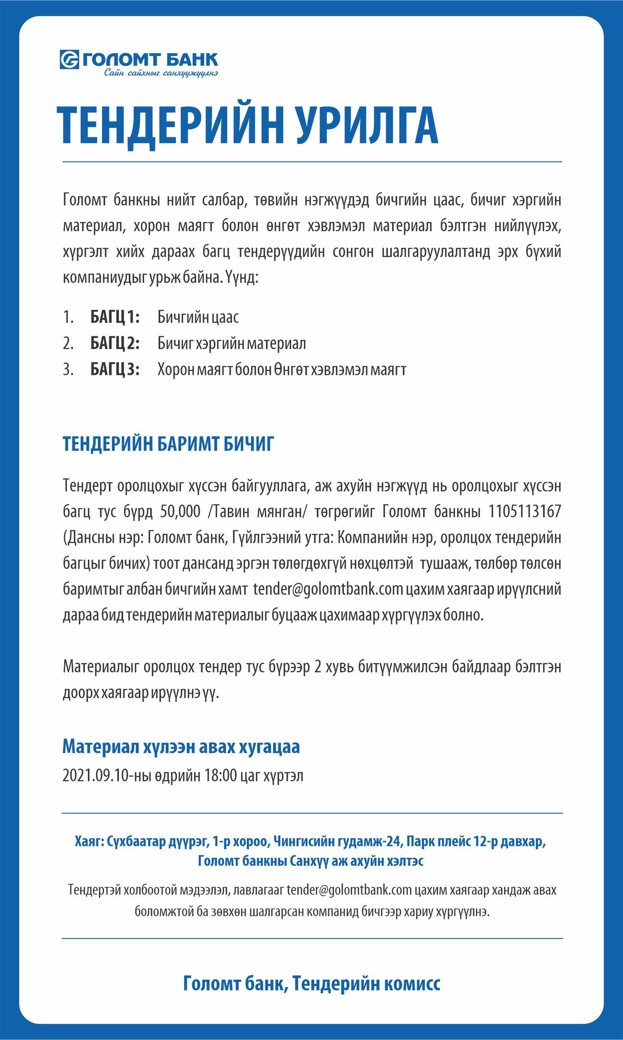 Голомт банк: Тендерийн урилга