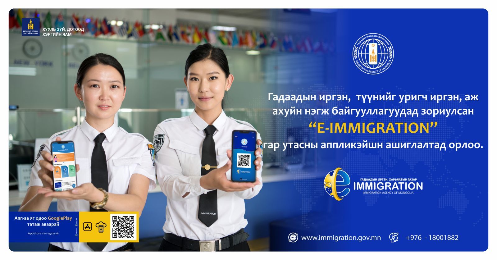 Гадаадын иргэн, харьяатын газраас гадаадын иргэн, түүнийг уригч иргэн, аж ахуйн нэгж, байгууллагуудад зориулсан “E-Immigration” гар утасны аппликэйшний андройд хувилбарыг хэрэглээнд нэвтрүүллээ. Тус аппликейшнийг ашиглан гадаадын иргэдийг бүртгүүлэх, Гадаадын иргэн, харьяатын газрын үйл ажиллагаатай холбоотой сүүлийн шинэ мэдээ, мэдээлэл авах боломжтой юм.