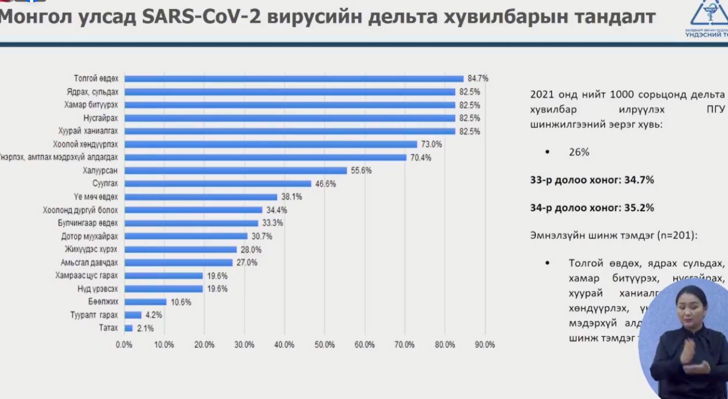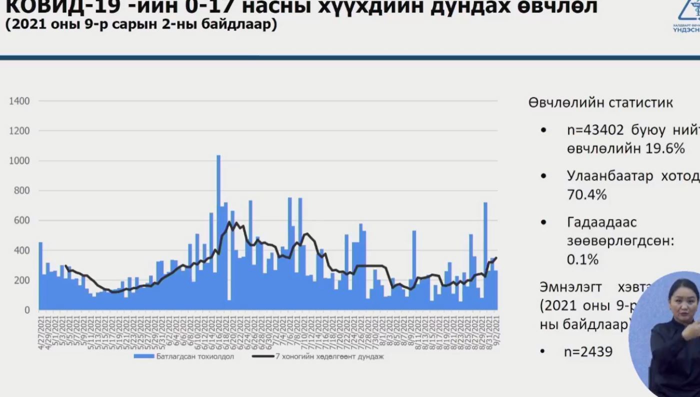-Наймдугаар сарын дунд үеэс эхлэн тохиолдлын тоо нэмэгдэж эхэлсэн. Тодруулбал, сүүлийн долоо хоногт өдөрт бүртгэгдэх тохиолдлын тоо огцом нэмэгдэж 3000 болон түүнээс дээш бүртгэгдэж байгаа. Нийт бүртгэгдэж байгаа тохиолдлуудын 73 хувь нь аймаг орон нутагт, 27 хувь нь нийслэлд батлагдаж байна. Өвчлөлийн түвшин зарим аймаг орон нутагт өндөр байгаа. Тухайлбал, Архангай, Баянхонгор, Булган, Өвөрхангай, Говь-Алтай, Дархан-Уул, Дорноговь, Дорнод, Сэлэнгэ, Увс, Ховд аймаг байна. Дараагийн 14 хоногт Улаанбаатар хотод өдөрт бүртгэгдэх шинэ тохиолдлын тоо 900-аас дээш болно гэсэн таамаг гаргасан.