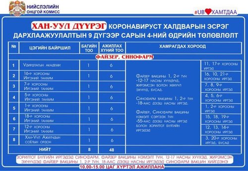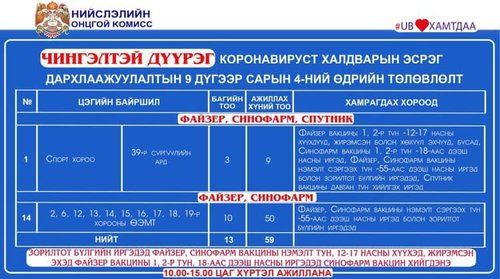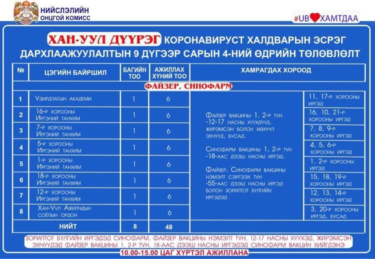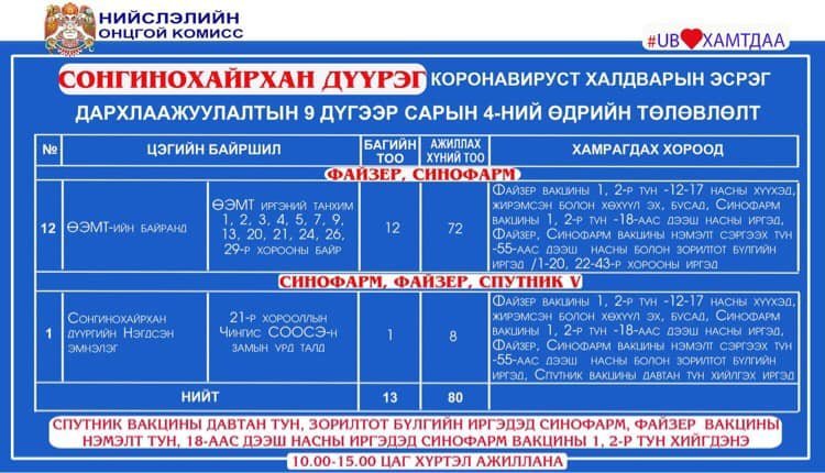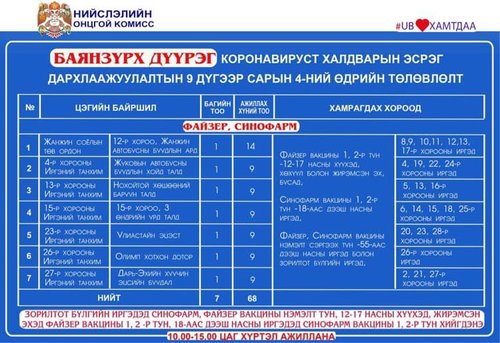 Өнөөдөр Улаанбаатар хотод явуулын 4, суурин 57 цэгт 76 багийн 398 эмч, ажилтан ажиллаж, 7414 иргэнийг дархлаажуулахаар төлөвлөжээ. Дархлаажуулалтын цэгүүд 10:00-15:00 цаг хүртэл ажиллана.