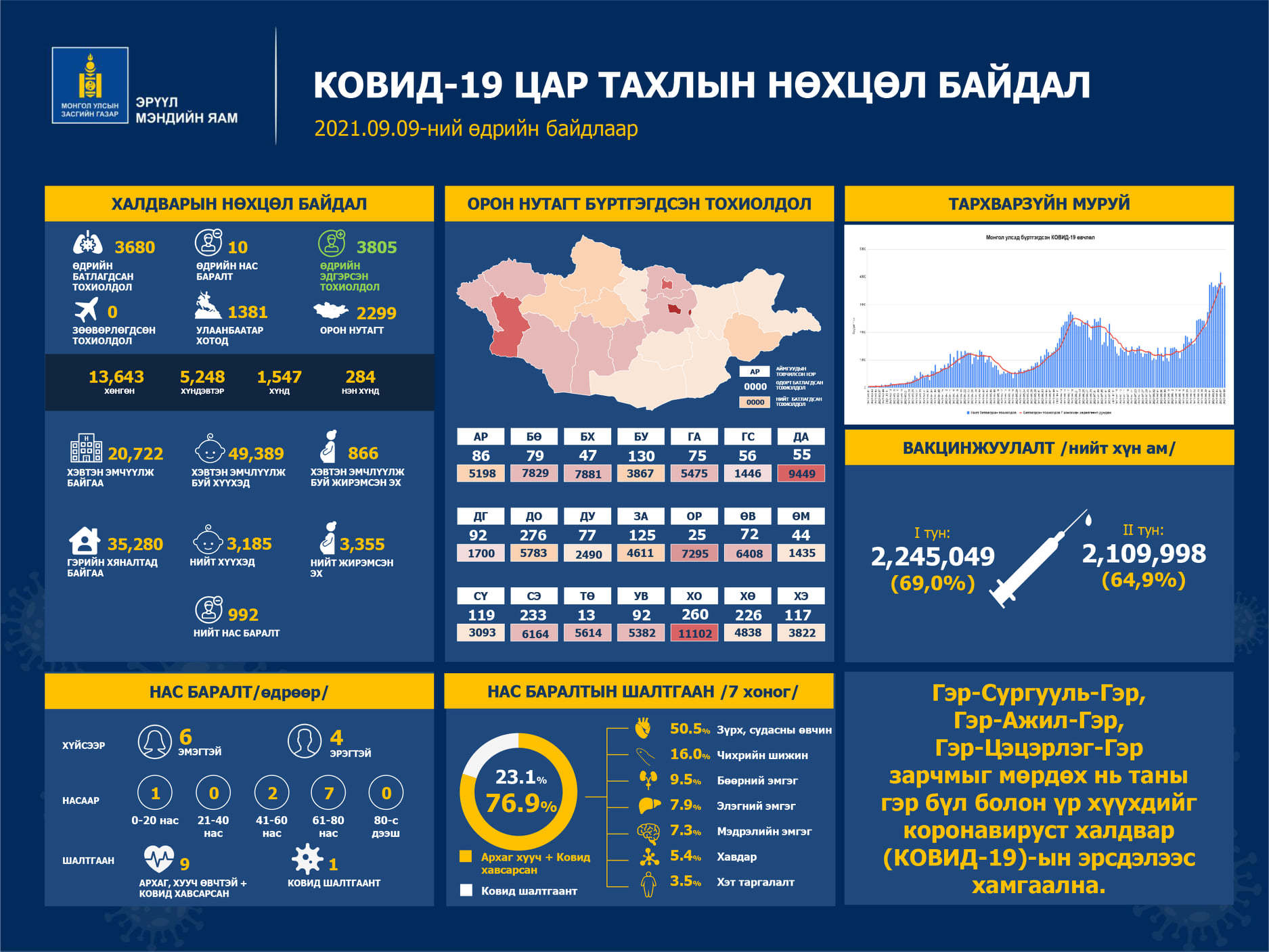 Эрүүл мэндийн яамнаас коронавирусийн халдварын 2021 оны 09 дүгээр сарын 09-ны өдрийн нөхцөл байдлын статистик мэдээллийг гаргалаа. Өнөөдөр шинээр 3680 тохиолдол нэмж бүртгэгджээ. Шинээр батлагдсан тохиолдлуудын 1381 нь Улаанбаатар хотод, 2299 нь орон нутагт бүртгэгджээ. Мөн энэ өдөр халдварын улмаас 10 хүн нас баржээ. Ингэснээр нийт нас баралт 992 боллоо.