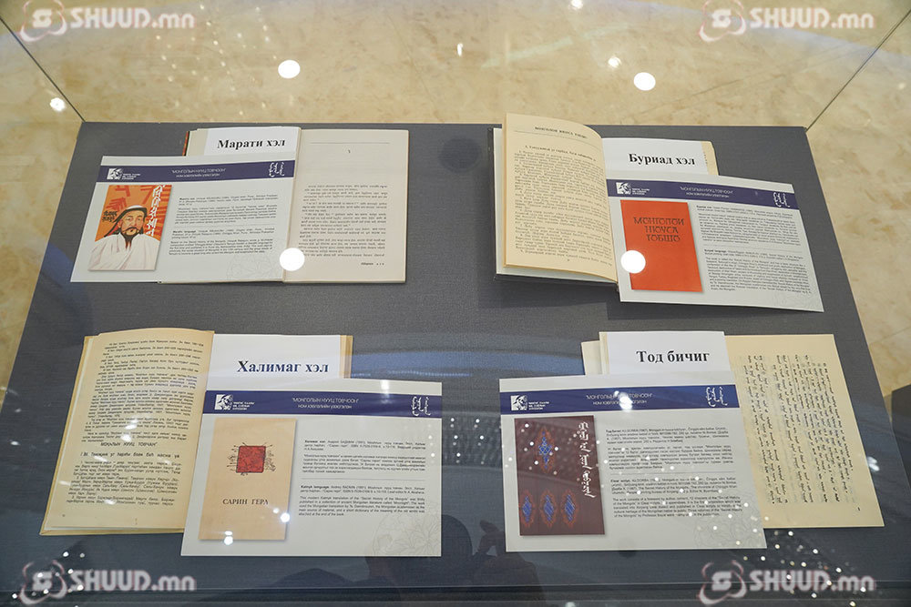 Мөн тус хүрээлэнгийн зөвлөх, ШУА-ийн Хэл зохиолын хүрээлэнгийн тэргүүлэх эрдэм шинжилгээний ажилтан, доктор, Монгол Улсын Шинжлэх Ухааны гавьяат зүтгэлтэн Э.Пүрэвжавтэй хамтран өдгөө Монголын нууц товчоог гадаадын 30 гаруй хэлээр орчуулан хэвлүүлснийг эл үзэсгэлэнгээр олон нийтэд дэлгэн үзүүлж байна.