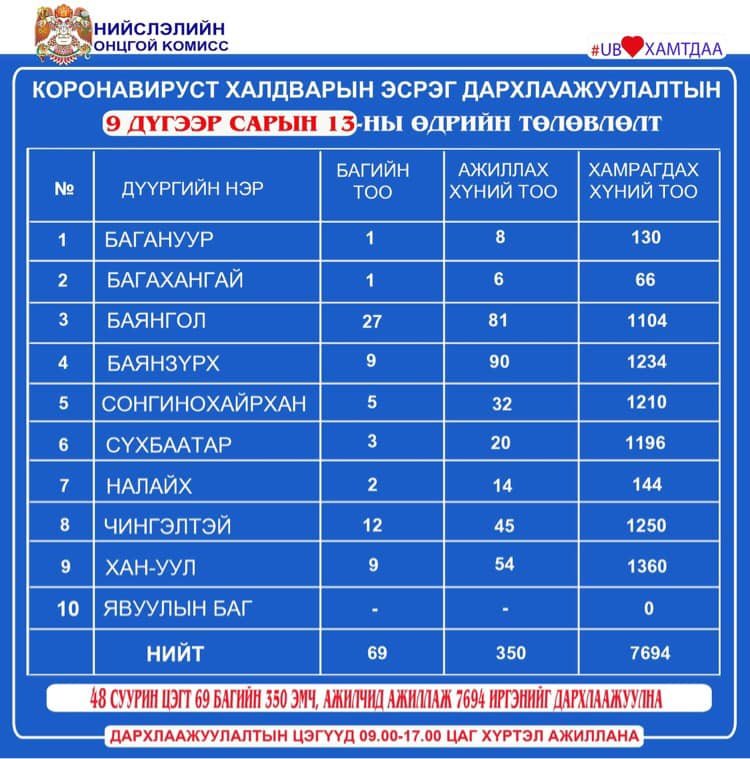 Харин өнөөдөр /2021.09.13/ Улаанбаатар хотод суурин 48 цэгт 69 багийн 350 эмч, ажилтан ажиллаж, 7694 иргэнийг дархлаажуулахаар төлөвлөлөө. Дархлаажуулалтын цэгүүд 09:00-17:00 цаг хүртэл ажиллана.