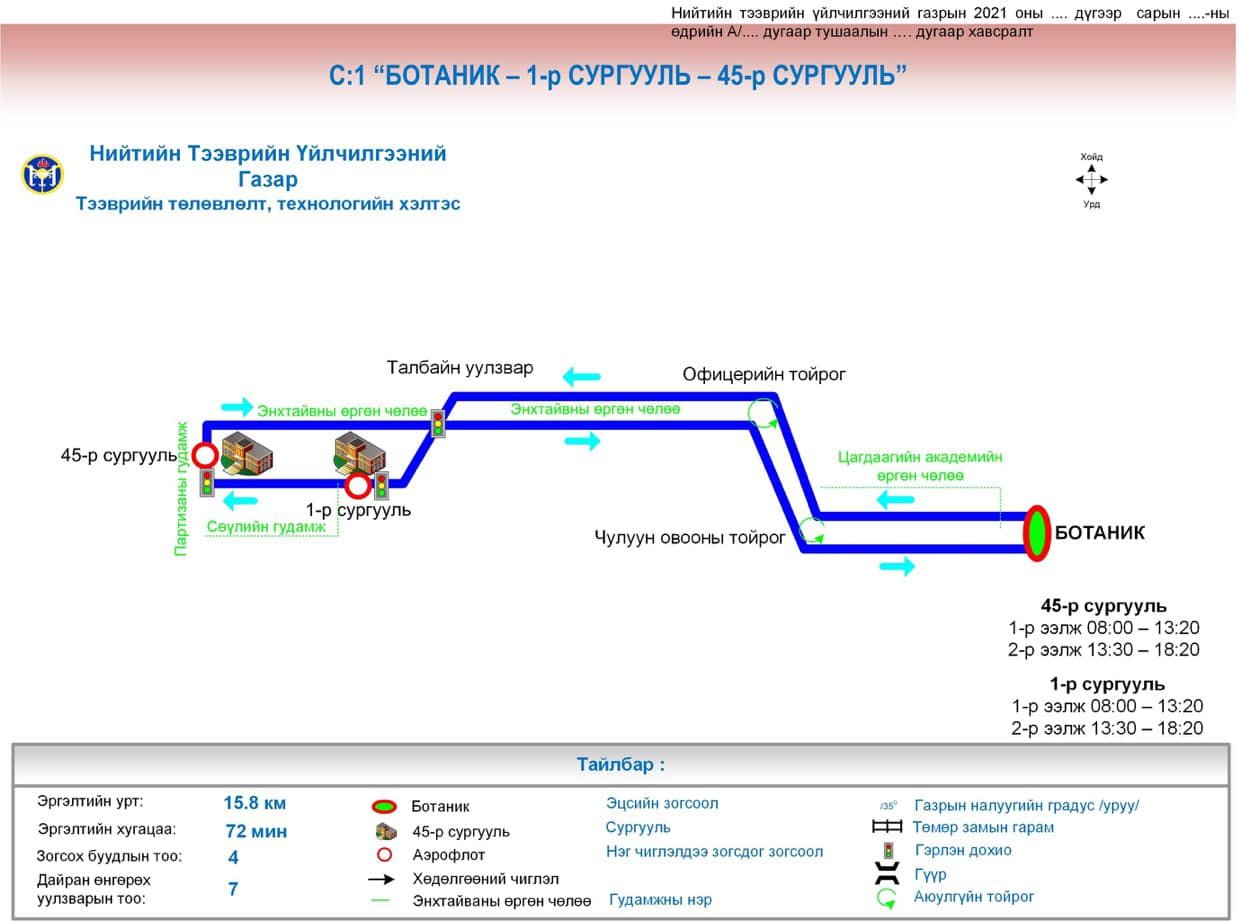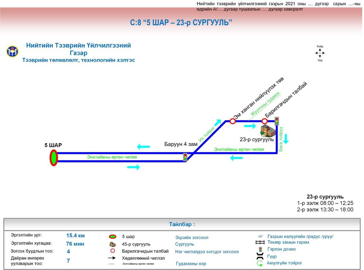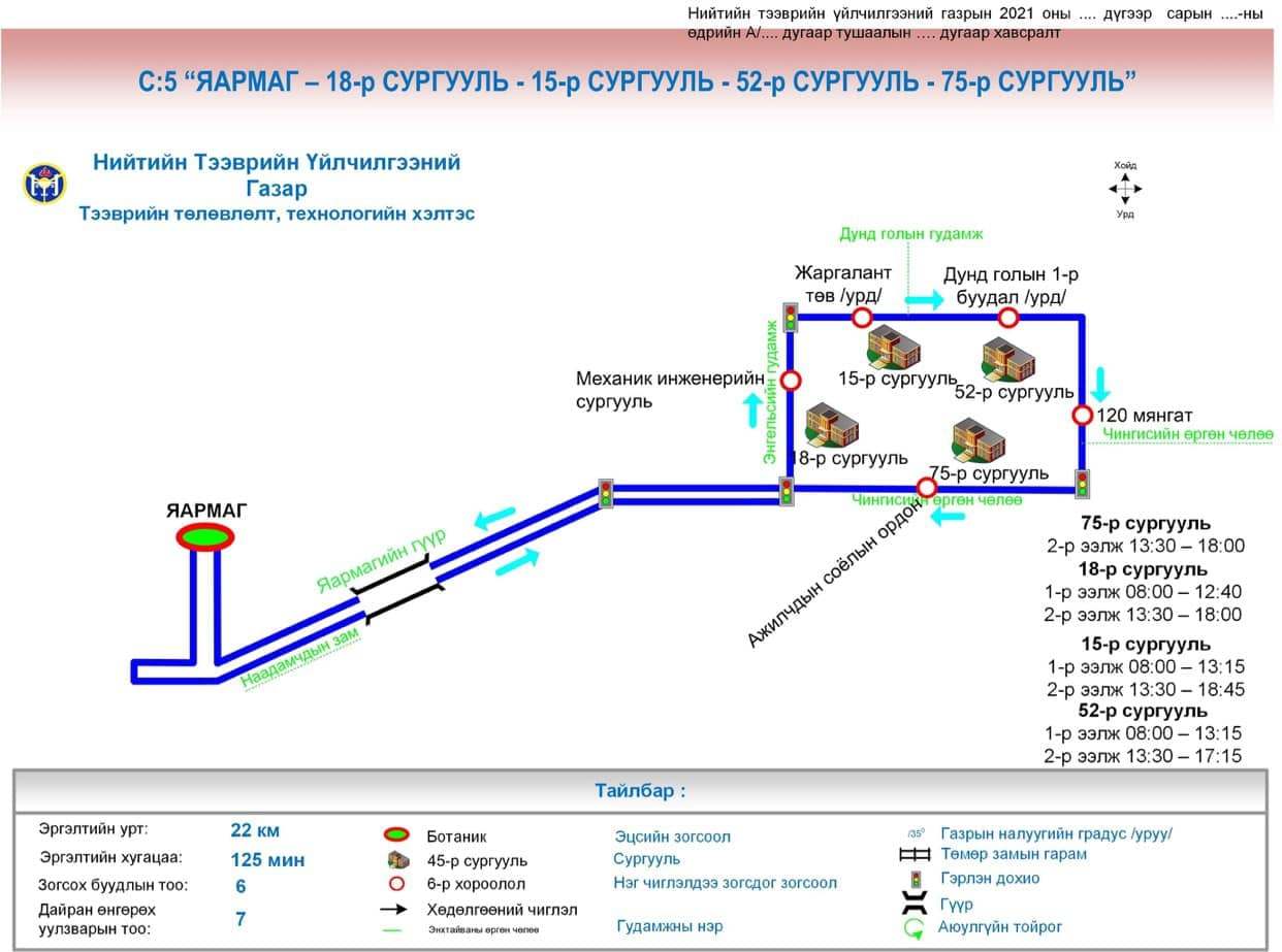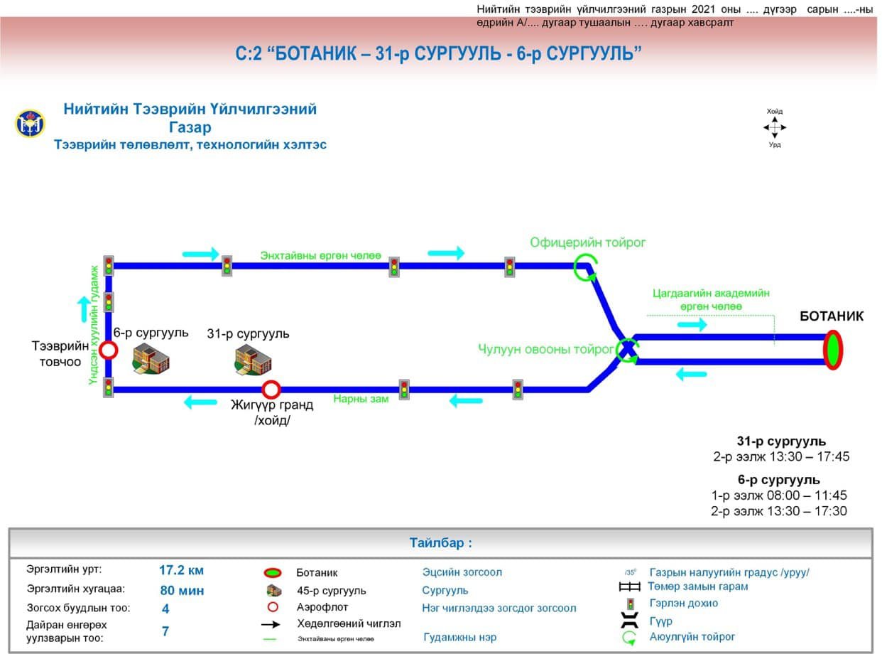 Нийслэлийн Нийтийн тээврийн үйлчилгээний газраас сургуулийн автобусны чиглэл, маршрутыг боловсруулан баталсан. Үүний дагуу өглөө 6.30-7.00, өдөр 11.50-12.50, орой 16:00-18:30 цагуудад үйлчлэх юм. Сургуулийн автобусны үйлчилгээнд хяналт тавих зорилгоор сургуулийн захиргааны зүгээс “Хүүхэд зохицуулагч”-ийг томилж, гэрээ байгуулж хамтран ажиллаж байна.