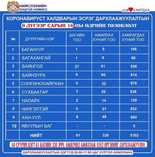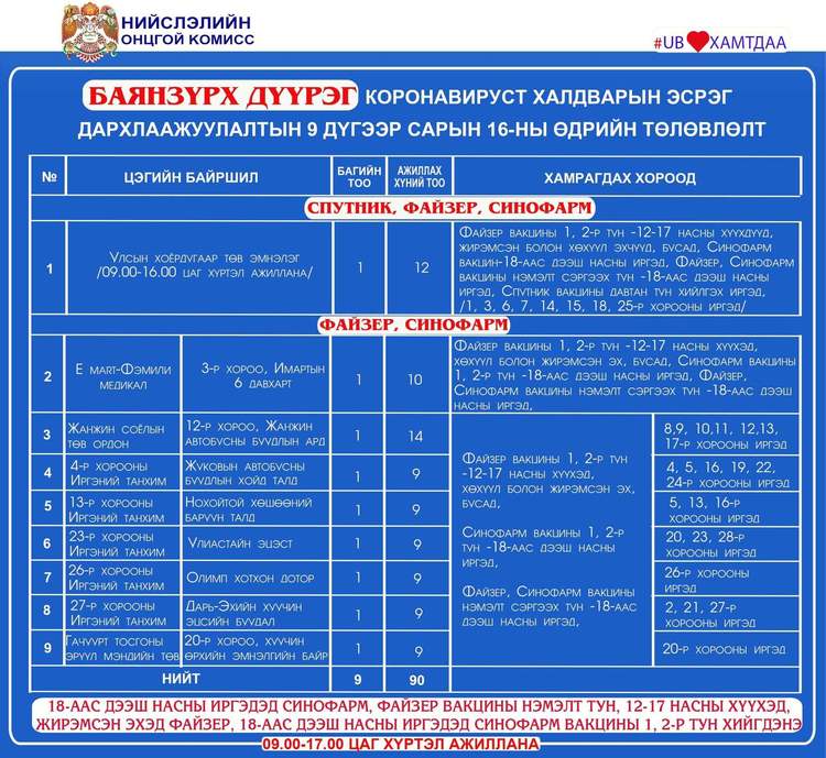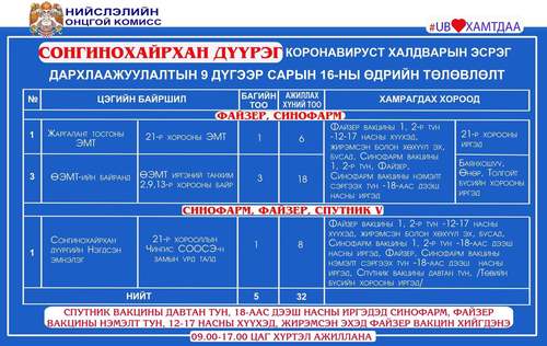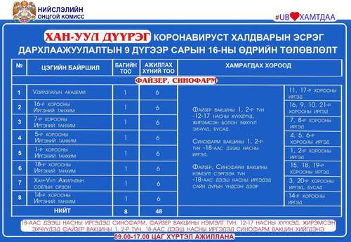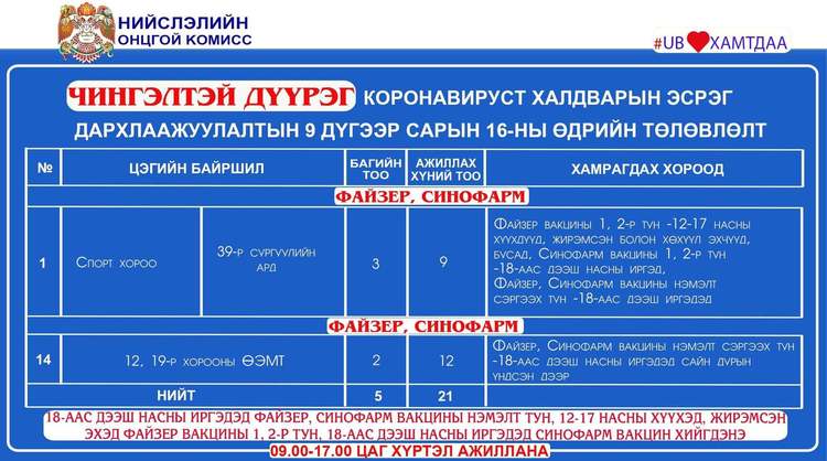 Дархлаажуулалтын цэгүүд 09:00-17:00 цаг хүртэл ажиллана. Дархлаажуулалтын цэгийг дүүрэг тус бүрээр танилцуулж байна.