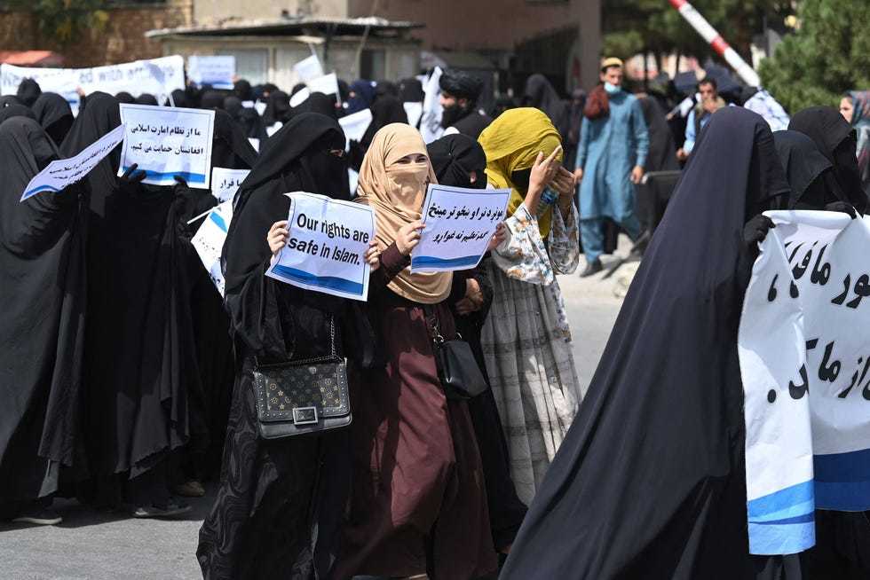 Энд дуулгахад, талибуудыг эрх барих болсны дараа Афганы эмэгтэйчүүд ардчилал, эмэгтэйчүүдийн эрхийг шаардан жагсаж байлаа. Талибууд засгийн эрхэнд гарсныхаа дараа эмэгтэйчүүдийг эрчүүдтэй хамт ажиллах, тэдэнтэй хамт их дээд сургуульд суралцах, түүнчлэн спортоор хичээллэхийг ч хориглосон юм.