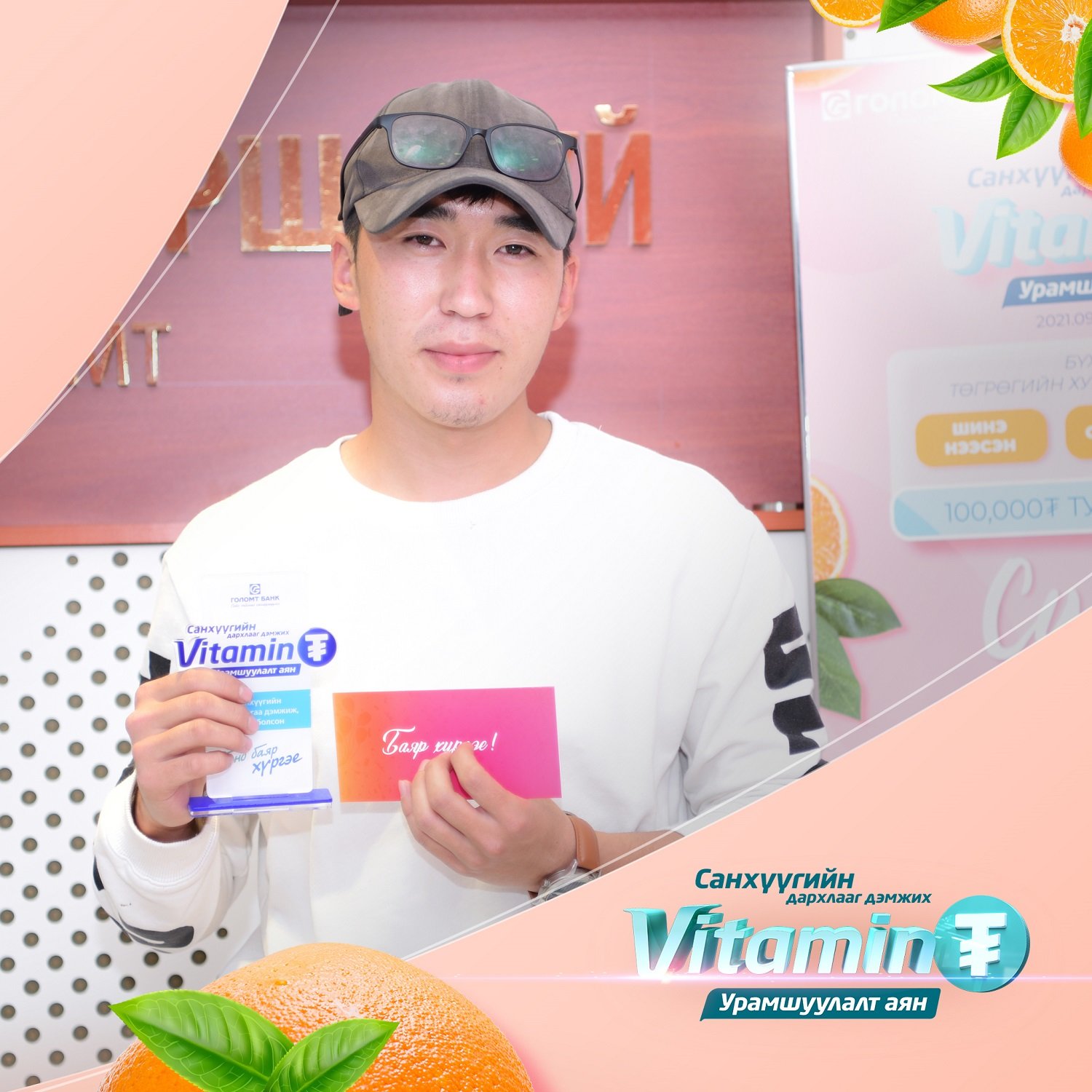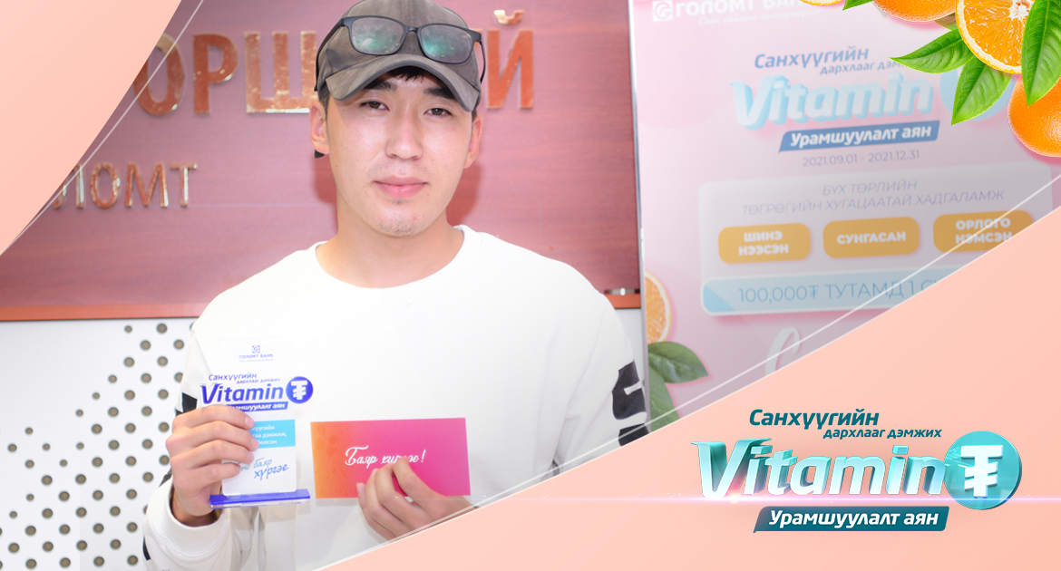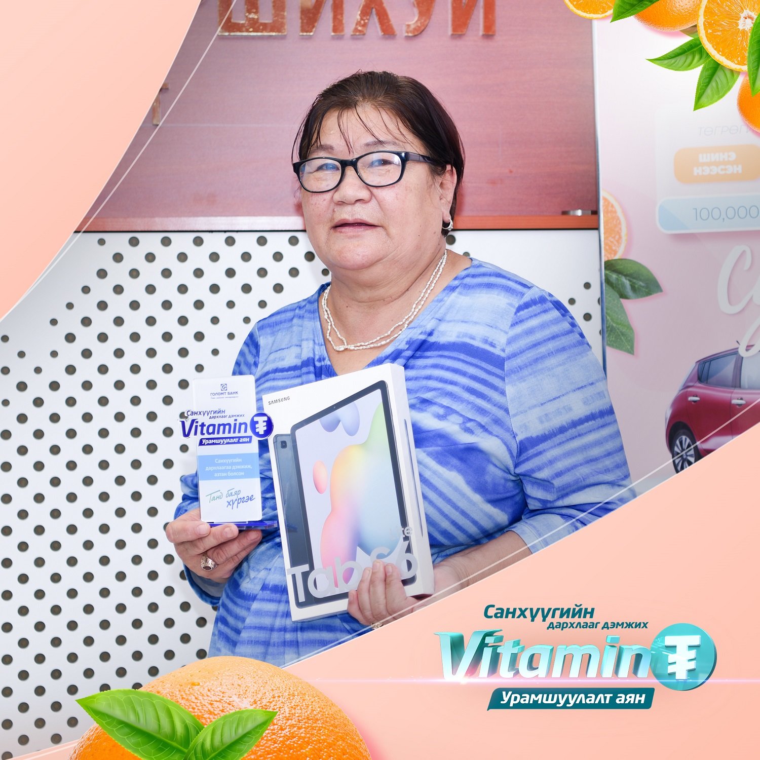 Голомт банк иргэдийн санхүүгийн дархлааг дэмжих “Витамин ₮” хадгаламжийн урамшуулалт аяныг зохион байгуулж байна. “Витамин ₮” аяны азтануудыг долоо хоног бүрийн Баасан гарагт Golomt bank болон Ikon News фэйсбүүк хуудсуудаар шууд лайв хийж нийт 102 азтай харилцагчийг тодруулна. Харин энэхүү аяны эхний азтанууд 9-р сарын 10-ны өдөр тодорлоо. Энэ удаагийн лайваар Galaxy TAB S6 Lite, Galaxy buds PRO, И-Март худалдааны төвийн эрхийн бичиг зэрэг нийт 6 хонжворын эздийг тодруулсан юм.