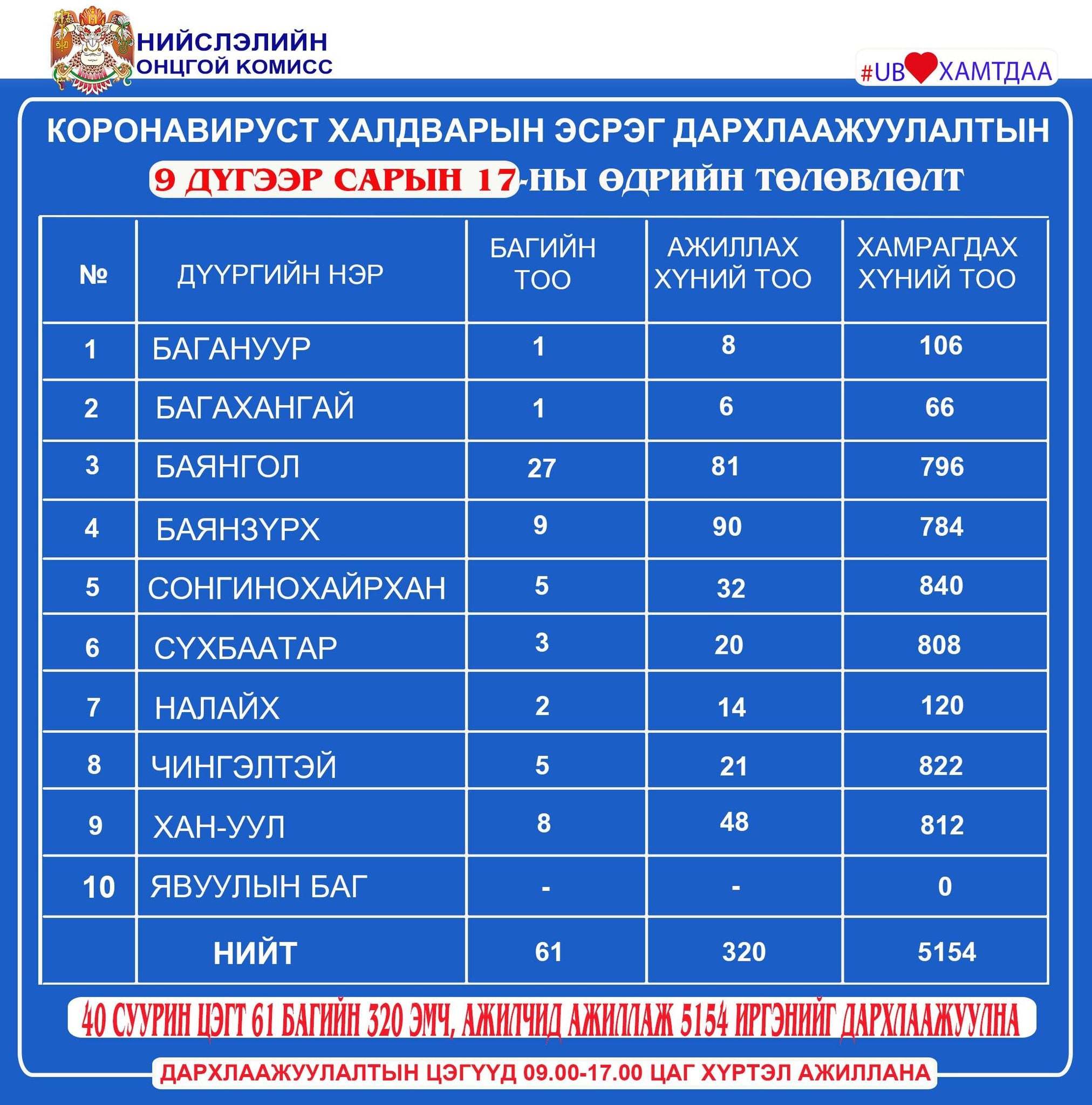 Өнөөдөр /2021.09.17/ Улаанбаатар хотод суурин 40 цэгт 61 багийн 320 эмч, ажилтан ажиллаж, 5154 иргэнийг дархлаажуулахаар төлөвлөлөө. Дархлаажуулалтын цэгүүд 09:00-17:00 цаг хүртэл ажиллана.