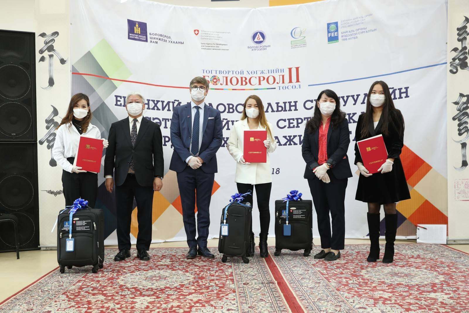 Энэ хүрээнд “Тогтвортой хөгжлийн боловсрол II” төслийн түшиц сургуулиуд дээр ажиллах 23 сэтгэл зүйч өнөөдөр сертификатаа гардан авлаа. Мэргэшүүлэх сургалт цаг үеийн нөхцөл байдлаас шалтгаалан 21 хоногийн онлайн сургалт, 14 хоногийн танхимын сургалт, 14 хоногийн мэргэжлийн байгууллагууд дээр биечлэн хийж турших дадлага ажил гэсэн 3 чиглэлээр зохион байгуулагдсан.