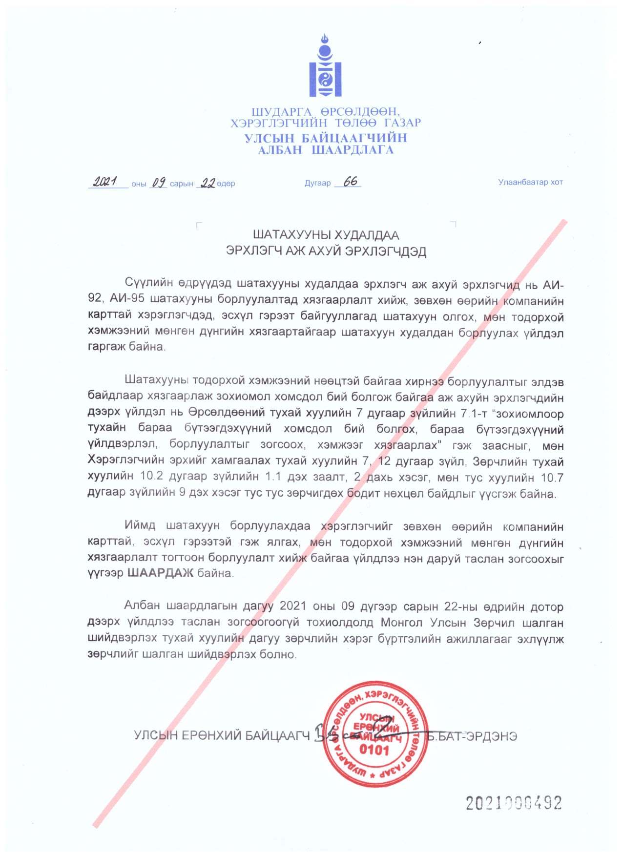 Тиймээс шатахуун борлуулахдаа хэрэглэгчийн зөвхөн өөрийн компанийн карттай эсвэл гэрээтэй гэж ялгах, мөн тодорхой хэмжээний мөнгөн дүнгийн хязгаарлалт тогтоон борлуулалт хийж байгаа үйлдлээ нэн даруй зогсоохыг ШААРДАЖ байна.