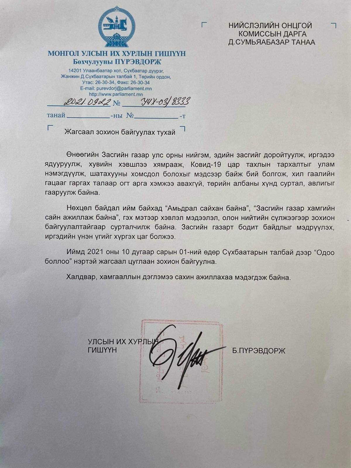 ИХ ХУРЛЫН ГИШҮҮН БОЛГОН ТӨРИЙН БАЙГУУЛАГУУДАД МЭДЭГДЭЛ ХҮРГЭЭД БАЙДАГ БОЛЖ БАЙГАА ЮМ УУ ТЭГВЭЛ ТӨР БАЙХЫН ХЭРЭГ ЮУН ПҮРЭВДОРЖИЙГ ОЛОН НИЙТИЙГ ҮЙМҮҮЛЭН ТУРХИРАХЫГ ОРОЛДОЖ БАЙГАА СЭДВЭЭР ШҮҮХЭД ДУУДАХ ЦАГ, ШОРОНД СУУЛГАХ БОЛЗОЛ ХАНГАГДЖЭЭ