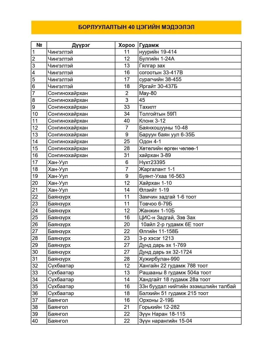 Сайжруулсан шахмал түлшийг өнөөдрөөс борлуулж эхэллээ. Эхний ээлжинд дараах 40 цэгээр борлуулж байна. Нийслэлийн хэмжээнд энэ өвөл 600 цэгээр сайжруулсан шахмал түлш борлуулах бөгөөд бүх цэгүүд 10 дугаар сарын нэгнээс ажиллаж эхэлнэ.