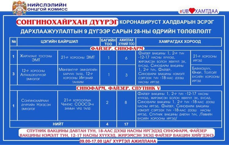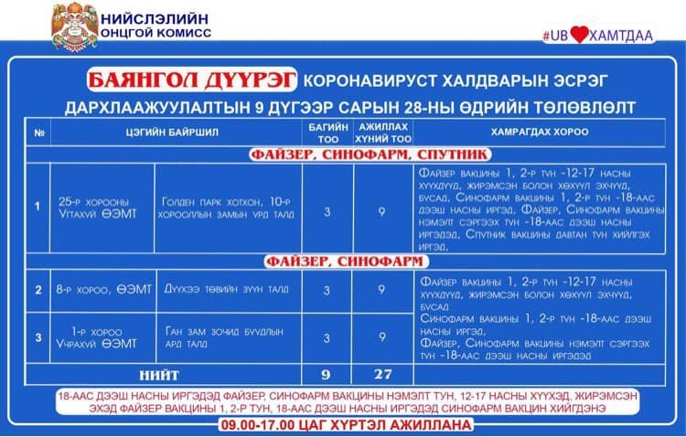 2021.09.28-нд Улаанбаатар хотод суурин 25 цэгт 34 багийн 191 эмч, ажилтан ажиллаж, 3452 иргэнийг дархлаажуулахаар төлөвлөлөө. Дархлаажуулалтын цэгүүд 09:00-17:00 цаг хүртэл ажиллана.