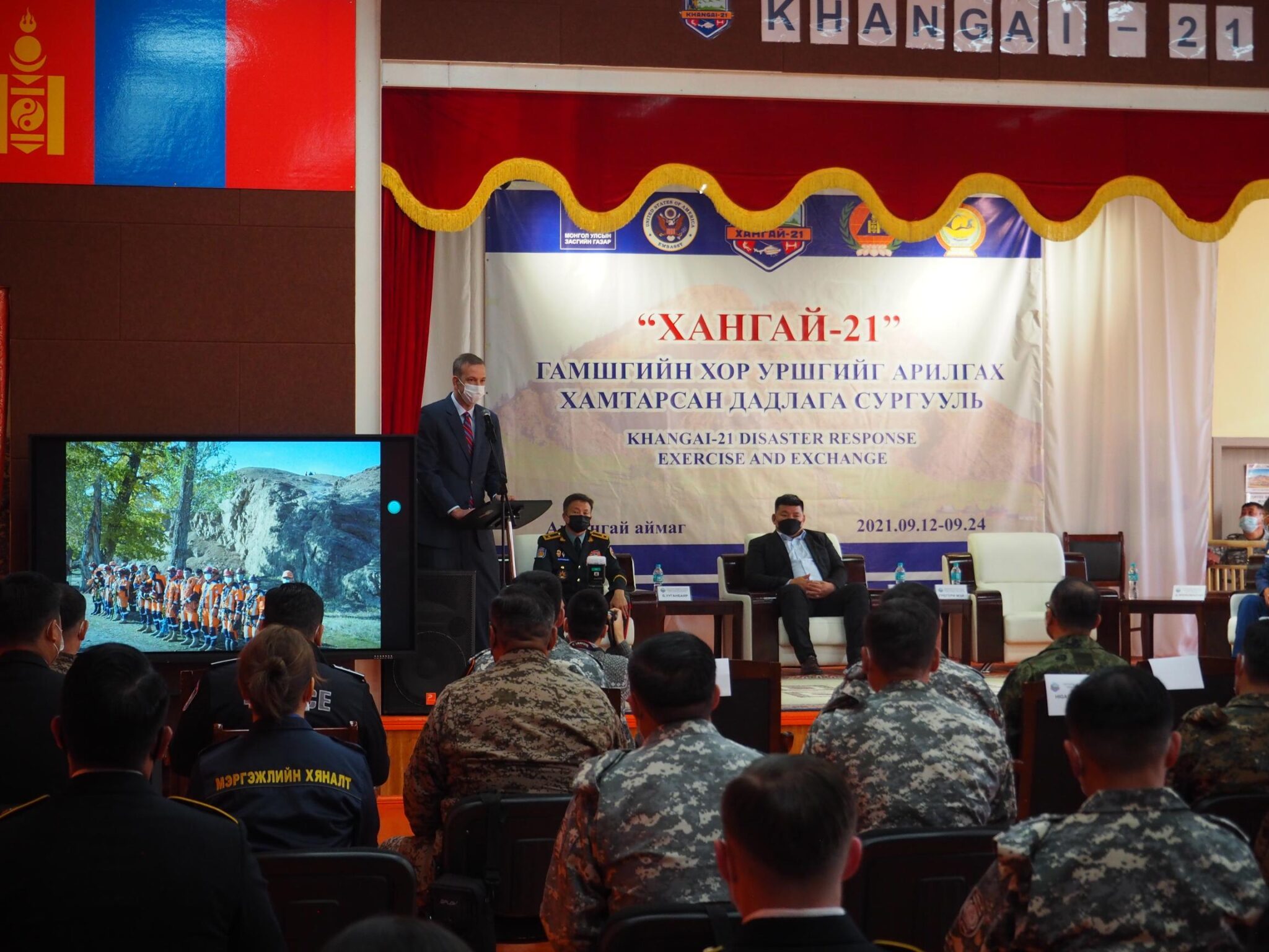 Есдүгээр сарын 14-нөөс 23-ны өдрүүдэд АНУ-ын ЭСЯ-ны Иргэн цэргийн дэмжлэг багаас Монгол Улсын Онцгой байдлын ерөнхий газартай хамтран гамшгаас хамгаалах “Хангай-21” сургуулилтыг Архангай аймагт зохион байгууллаа. Архангай, Баянхонгор, Булган, Завхан, Өвөрхангай, Хөвсгөл аймгийн Онцгой байдлын газруудтай хамтран АНУ-ын Агаарын цэргийн хүчний эмнэлгийн аврах ангийн ажилтнууд Өндрөөс аврах олсны сургалт болон Давчуу орон зайнаас аврах ажиллагааны дадлага сургуулилтыг удирдаж, Онцгой байдлын үеийн эмнэлгийн тусламж, Хямралын үеийн харилцаа холбоо, Гамшгийн удирдлага зэрэг дэмжих сургалтыг явууллаа. Монголын 180 гаруй оролцогчдоос гадна Япон, БНСУ, БНТУ-ын батлан хамгаалахын атташе нар ажиглагчаар оролцов.