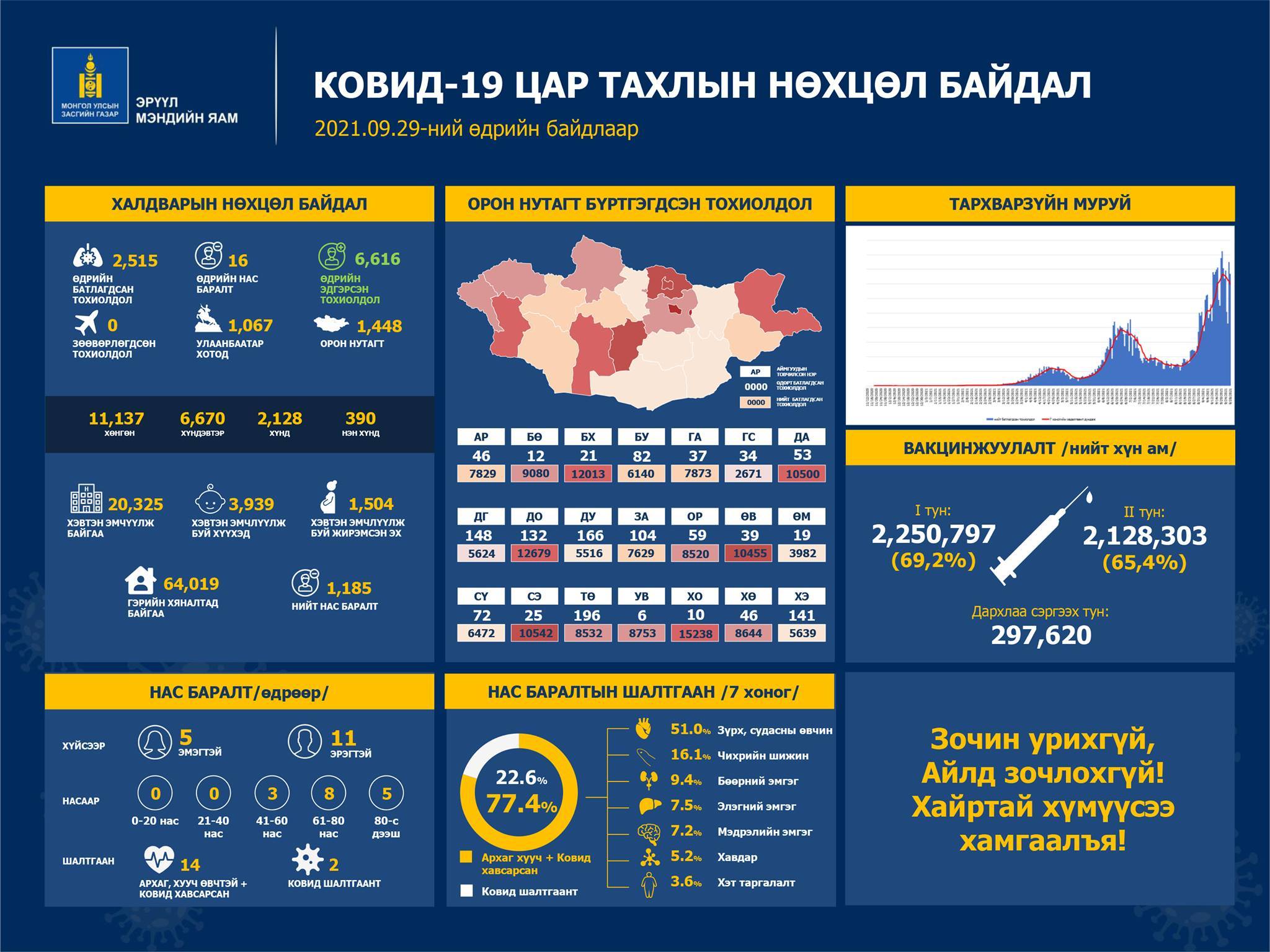 Эрүүл мэндийн яам коронавирусийн халдварын 2021 оны 09 дүгээр сарын 29-ны өдрийн тоон мэдээллийг гаргалаа. Энэ өдөр шинээр 2515 хүн халдвар авчээ. Шинээр илэрсэн халдварын 1067 нь Улаанбаатарт, 1448 нь орон нутагт бүртгэгдлээ. Мөн өдөр халдварын улмаас 41-80 насны 16 хүн нас барлаа. Ингэснээр Монгол Улсын 1185 хүн коронавирусийн халдвараар амь насаа алдаад байна.