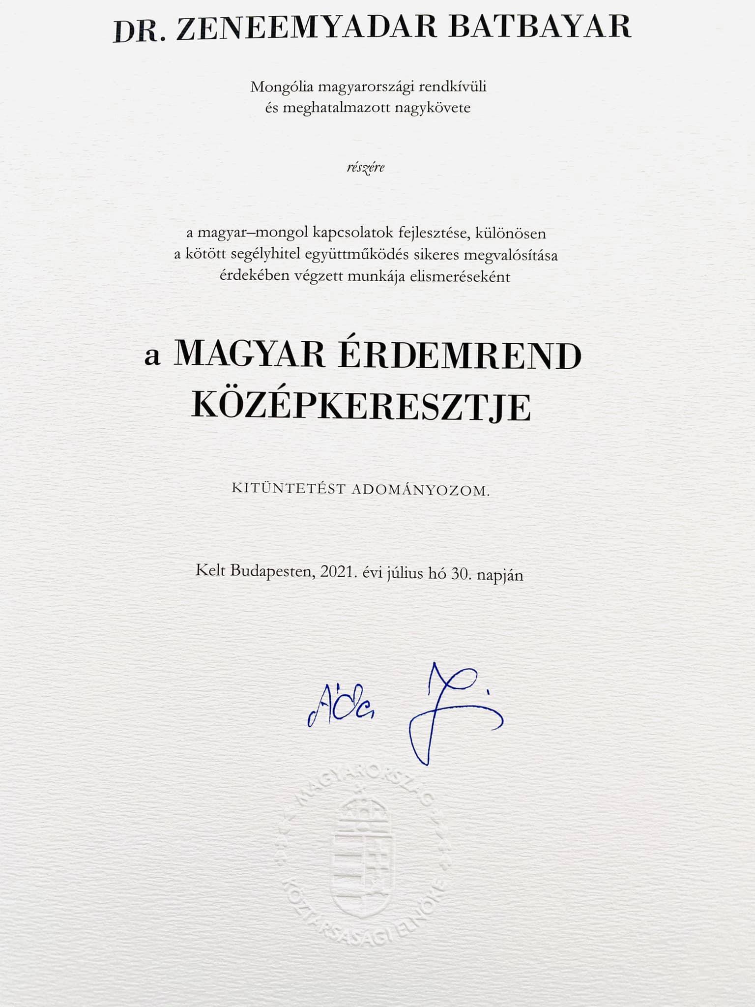 Энэ талаар Элчин сайд З.Батбаяр өөрийн цахим хуудаснаа "Унгар улсын ерөнхийлөгчийн зарлигаар Унгар улсын загалмайн гавьяаны одон (2-р зэрэг) шагнасныг өнөөдөр/2021.09.29/ Унгарын Гадаад харилцаа, Гадаад эдийн засгийн Яаманд гардан авлаа.