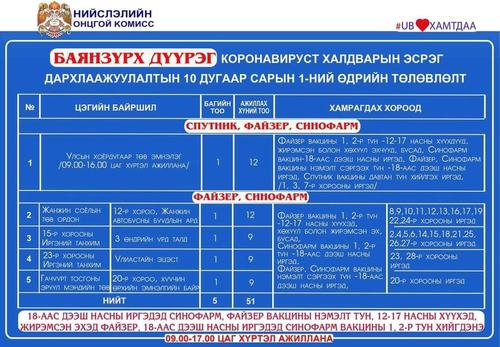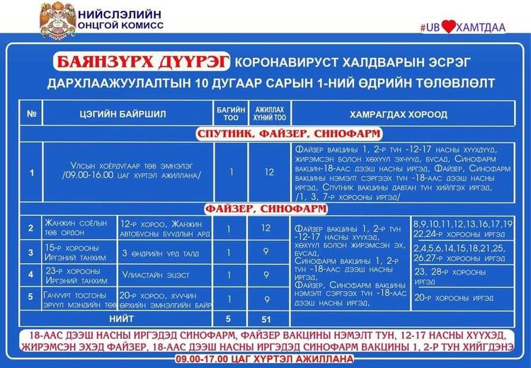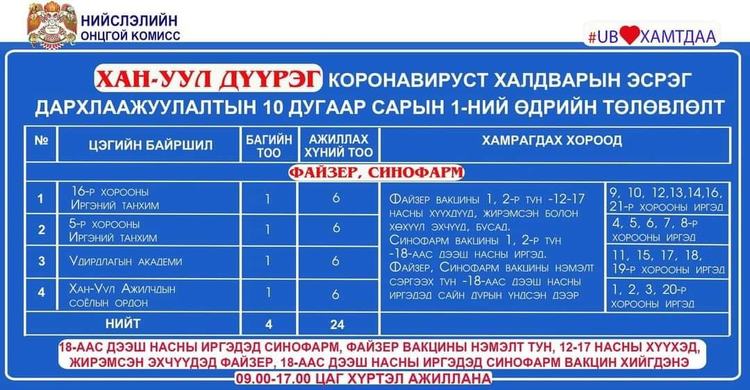 Өнөөдөр Улаанбаатар хотод суурин 24 цэгт 33 багийн 182 эмч, ажилтан ажиллаж, 2978 иргэнийг дархлаажуулахаар төлөвлөлөө. Дархлаажуулалтын цэгүүд 09:00-17:00 цаг хүртэл ажиллана. Дархлаажуулалтын цэгийг дүүрэг тус бүрээр танилцуулж байна.