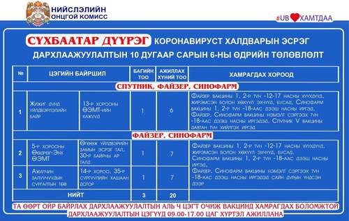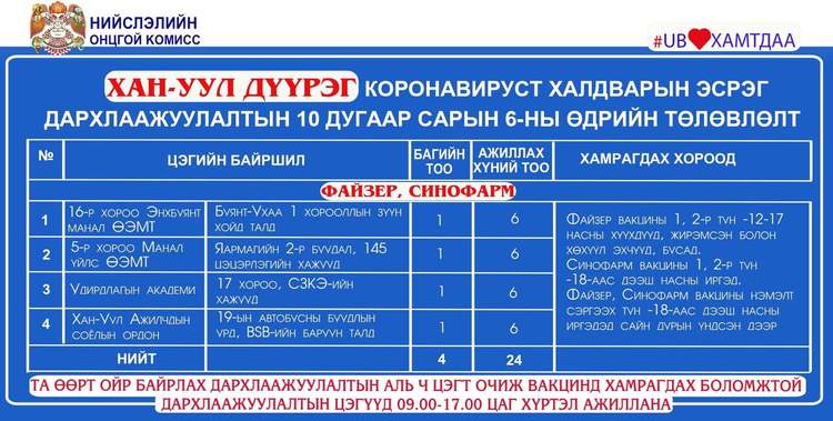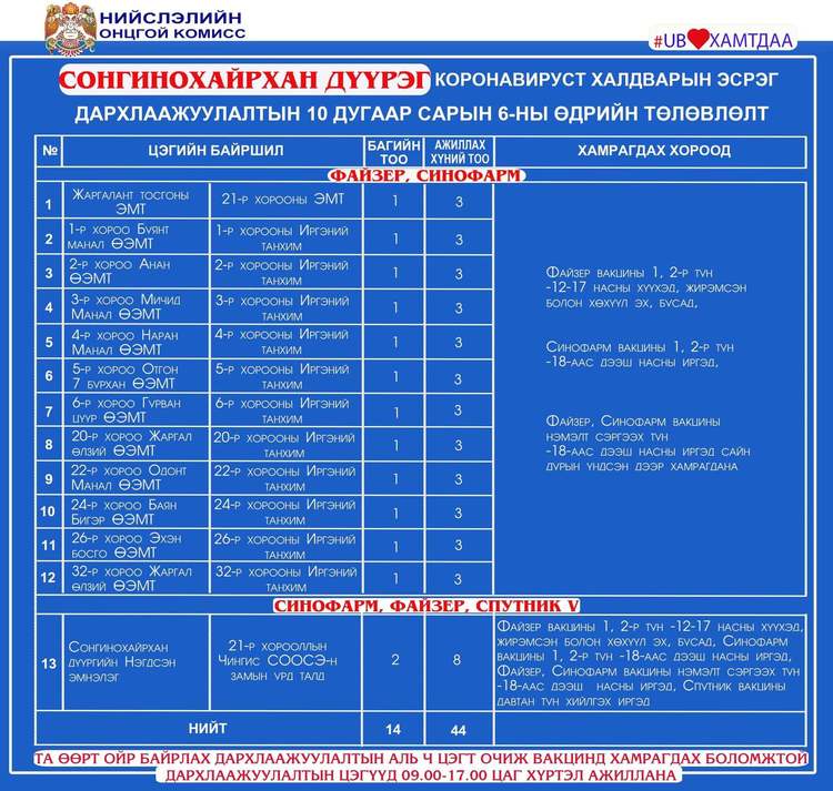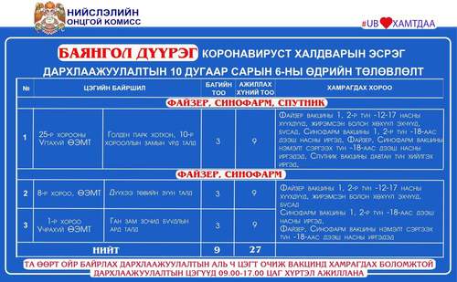 Өнөөдөр Улаанбаатар хотод суурин 37 цэгт 46 багийн 220 эмч, ажилтан ажиллаж, 2978 иргэнийг дархлаажуулахаар төлөвлөлөө. Та өөрт ойр вакцины аль ч цэгт очиж дархлаажуулалтад хамрагдах боломжтой. Дархлаажуулалтын цэгүүд 09:00-17:00 цаг хүртэл ажиллана.