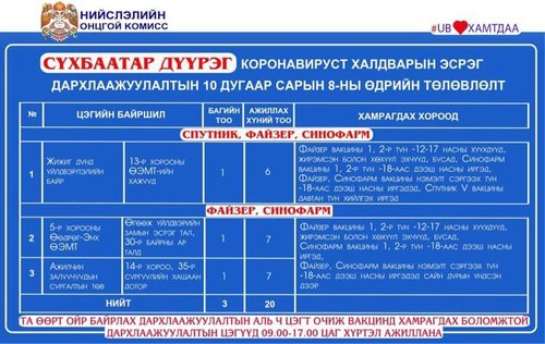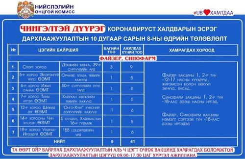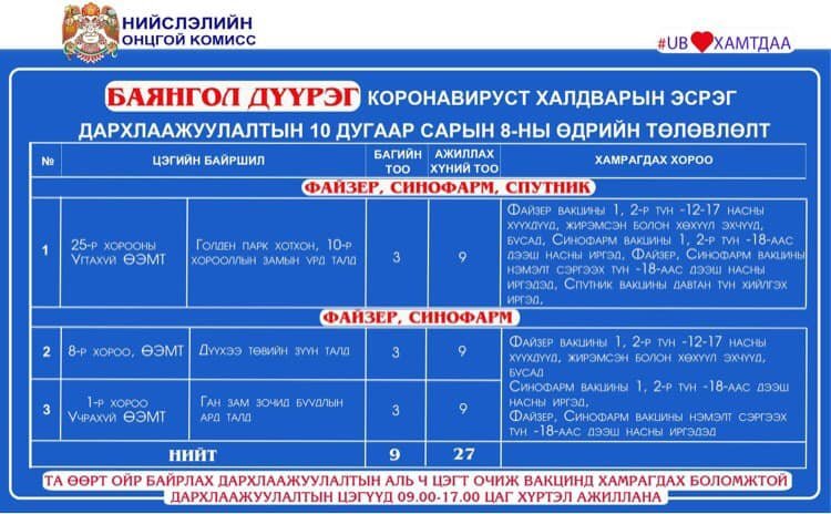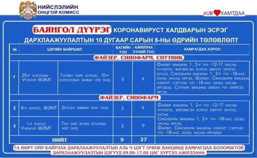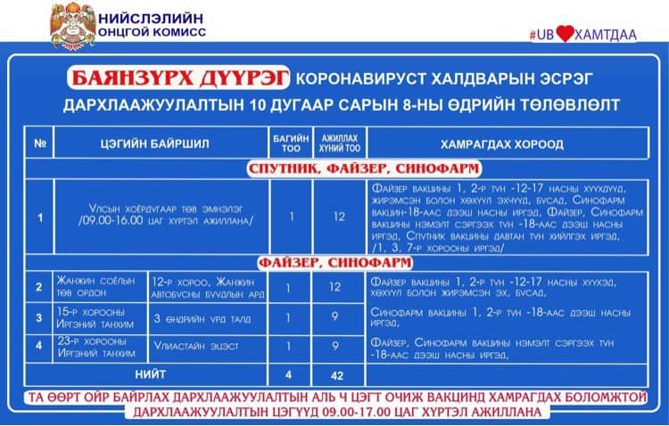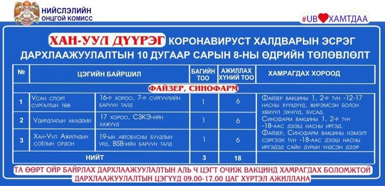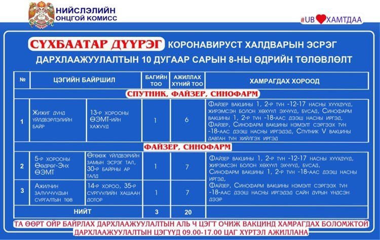 Өнөөдөр Улаанбаатар хотод 18 явуулын баг, 36 суурин цэгт 63 багийн 268 эмч, ажилтан ажиллаж, 3138 иргэнийг дархлаажуулахаар төлөвлөлөө. Та өөрт ойр вакцины аль ч цэгт очиж дархлаажуулалтад хамрагдах боломжтой. Дархлаажуулалтын цэгүүд 09:00-17:00 цаг хүртэл ажиллана. Дархлаажуулалтын цэгийг дүүрэг тус бүрээр танилцуулж байна.