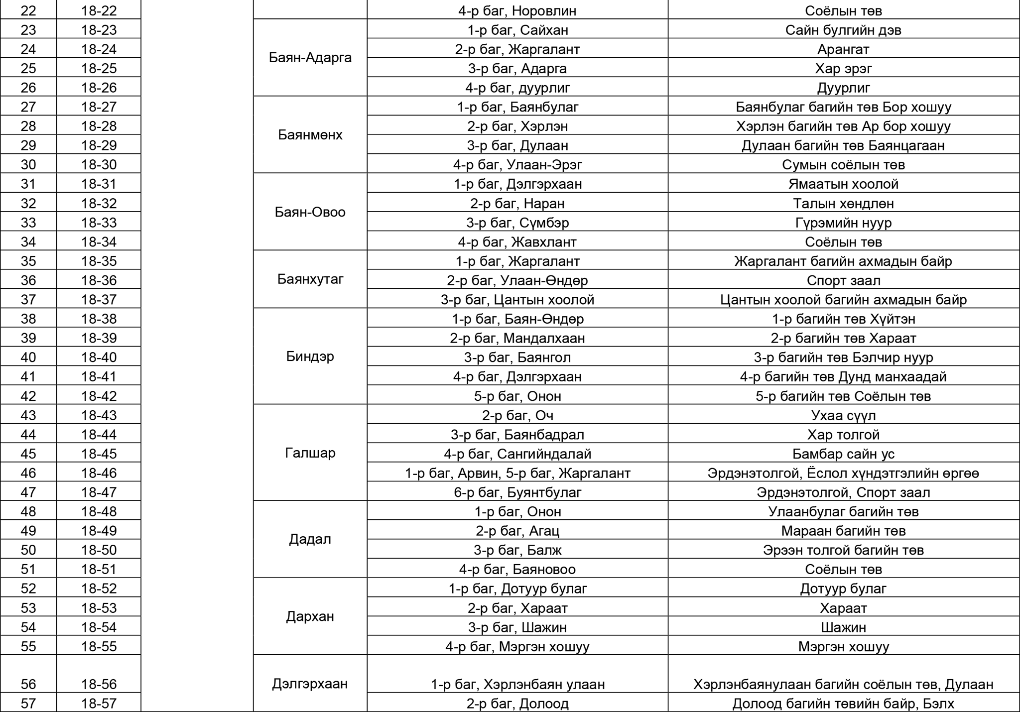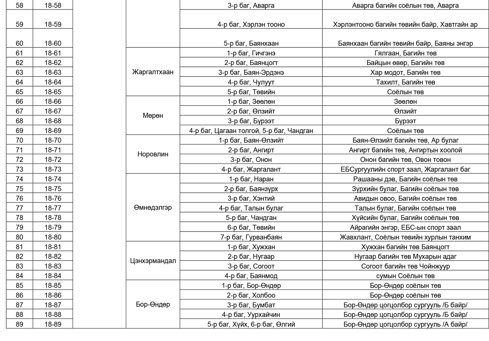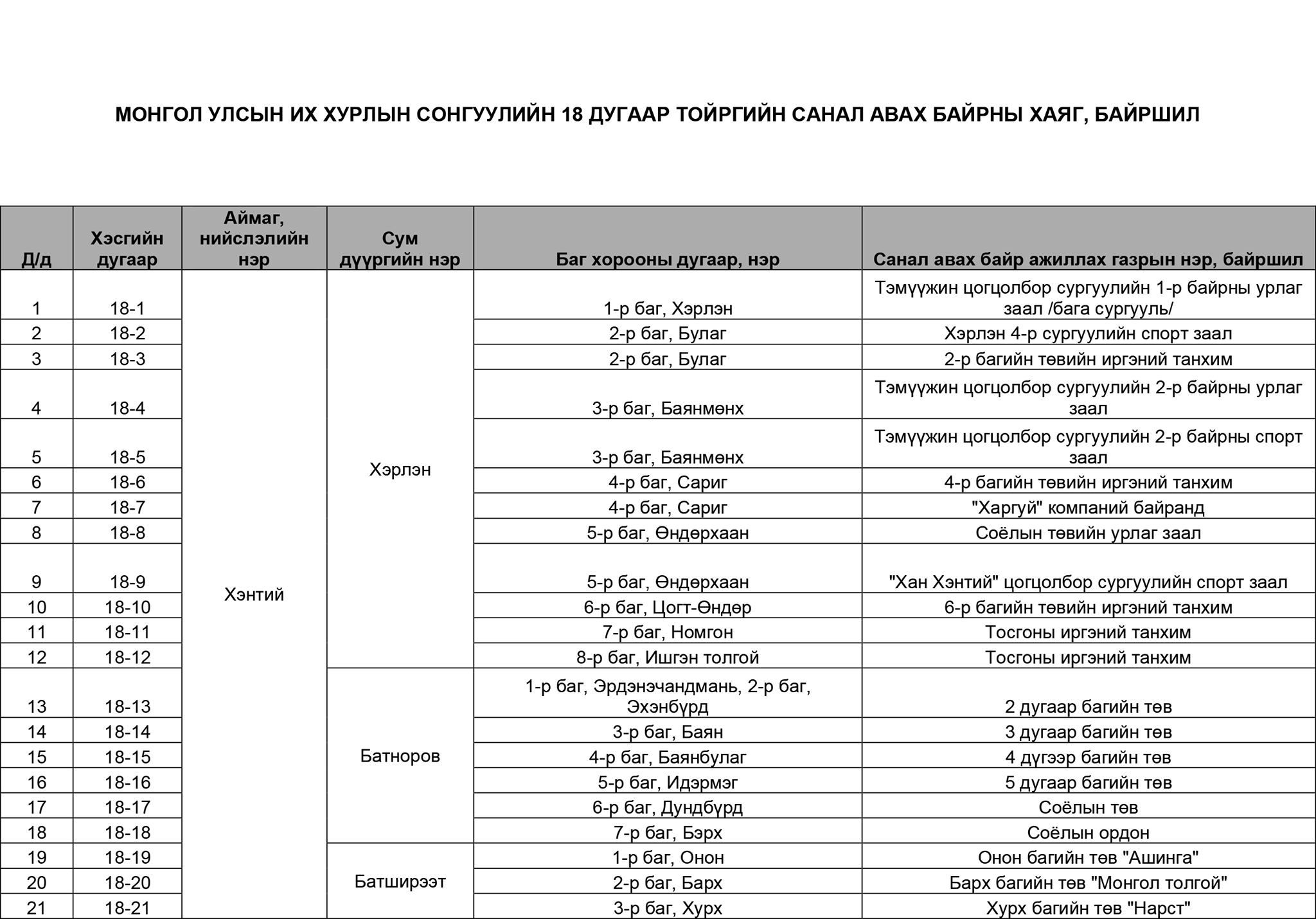 Монгол Улсын Их Хурлын сонгуулийн 18, 28 дугаар тойрогт явагдах нөхөн сонгуулийн санал хураах өдөр өнөөдөр болж байна. Улсын Их Хурлын сонгуулийн 18 дугаар тойрог буюу Хэнтий аймгийн сонгогчид саналаа өгөх хаяг, байршлын мэдээллийг хүргэж байна. УИХ-ын сонгуулийн 18 дугаар тойргийн сонгогчдын нэрийн жагсаалтад нийт 51,495 сонгогч бүртгэгджээ.