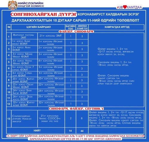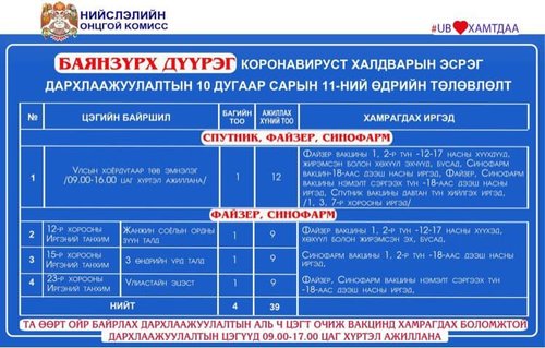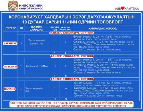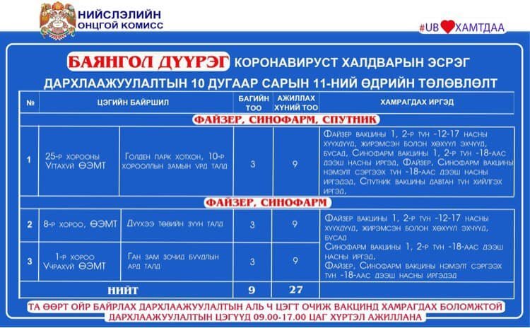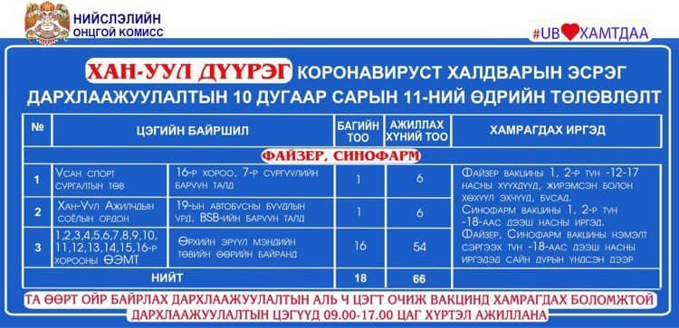 Өнөөдөр Улаанбаатар хотод явуулын 24 баг, 50 суурин цэгт 83 багийн 324 эмч, ажилтан ажиллаж, 4328 иргэнийг дархлаажуулахаар төлөвлөлөө. Та өөрт ойр вакцины аль ч цэгт очиж дархлаажуулалтад хамрагдах боломжтой. Дархлаажуулалтын цэгүүд 09:00-17:00 цаг хүртэл ажиллана. Дархлаажуулалтын цэгийг дүүрэг тус бүрээр танилцуулж байна.