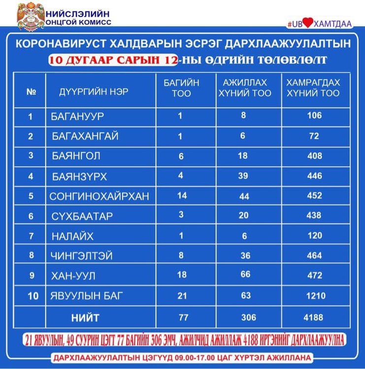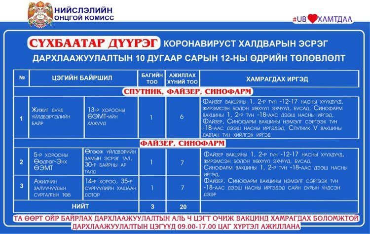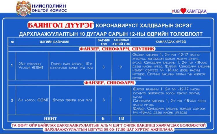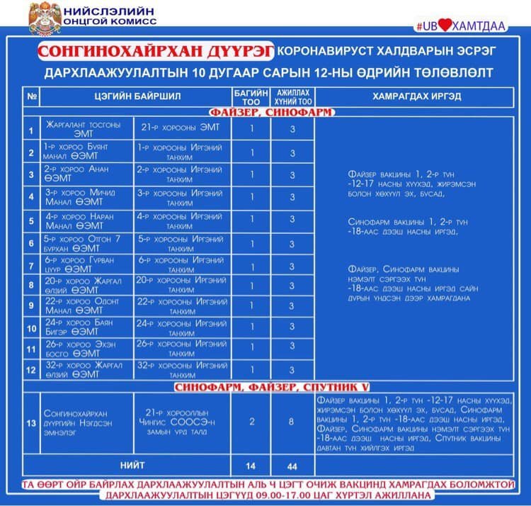 Өнөөдөр Улаанбаатар хотод явуулын 21 баг, суурин 49 цэгт 77 багийн 306 эмч, ажилтан ажиллаж, 4188 иргэнийг дархлаажуулахаар төлөвлөжээ. Та өөрт ойр вакцины аль ч цэгт очиж дархлаажуулалтад хамрагдах боломжтой. Дархлаажуулалтын цэгүүд 09:00-17:00 цаг хүртэл ажиллана. Дархлаажуулалтын цэгийг дүүрэг тус бүрээр танилцуулж байна.