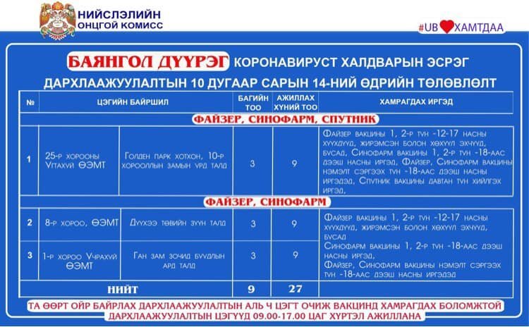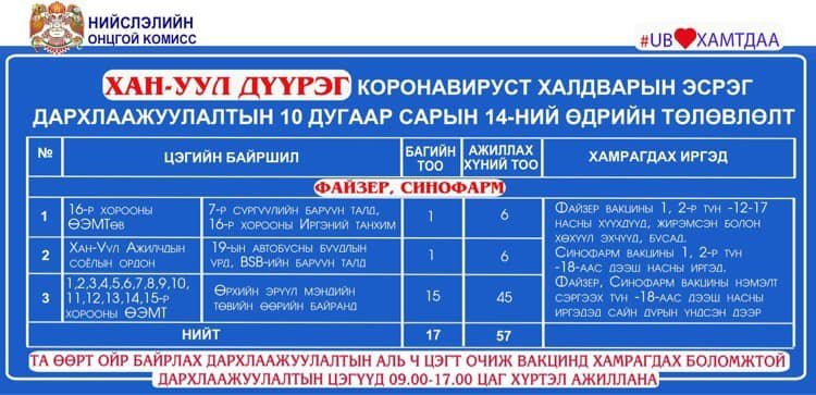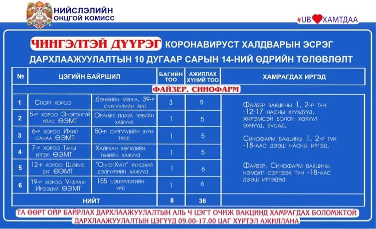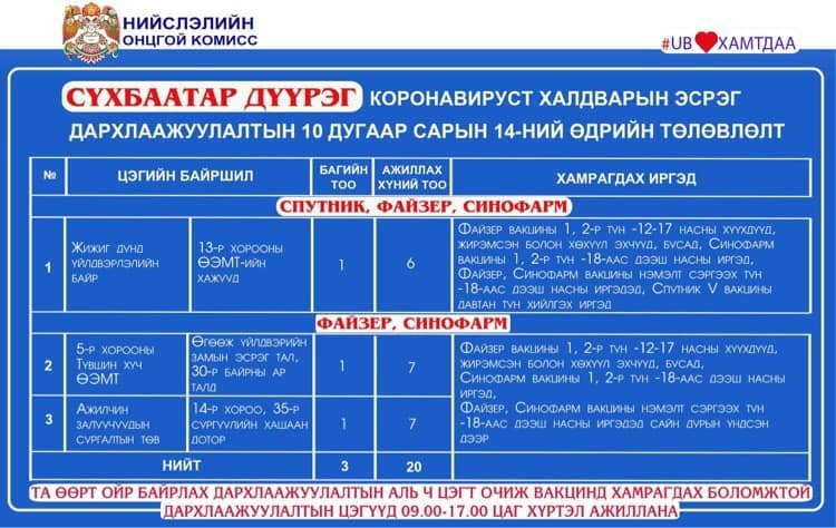 Өнөөдөр Улаанбаатар хотод явуулын 21 баг, суурин 48 цэгт 78 багийн 303 эмч, ажилтан ажиллаж, 4438 иргэнийг дархлаажуулахаар төлөвлөлөө. Та өөрт ойр вакцины аль ч цэгт очиж дархлаажуулалтад хамрагдах боломжтой. Дархлаажуулалтын цэгүүд 09:00-17:00 цаг хүртэл ажиллана. Дархлаажуулалтын цэгийг дүүрэг тус бүрээр танилцуулж байна.