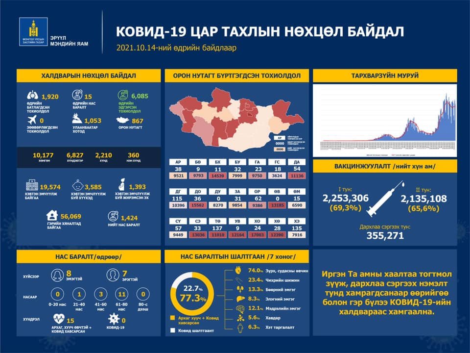 Эрүүл мэндийн яамнаас коронавирусийн халдварын 2021 оны 10 дугаар сарын 14-ний өдрийн тоон мэдээллийг гаргалаа. Энэ өдөр шинээр 1920 хүнээс халдвар илэрчээ. Шинээр батлагдсан тохиолдлуудын 1053 нь Улаанбаатарт, 867 нь орон нутагт бүртгэгджээ. Мөн халдварын улмаас 21-80 насны 15 хүн нас барлаа. Ингэснээр нийт нас баралт 1424 болов.