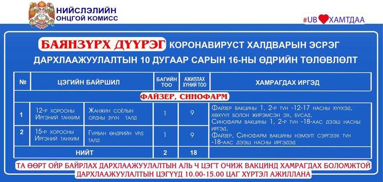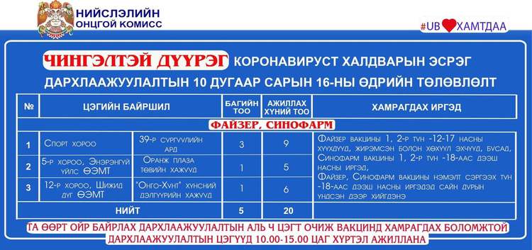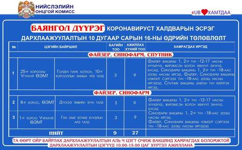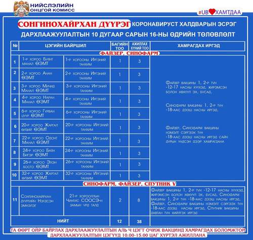 Өнөөдөр Улаанбаатар хотод явуулын 30 баг, суурин 27 цэгт 66 багийн 245 эмч, ажилтан ажиллаж, 5022 иргэнийг дархлаажуулахаар төлөвлөлөө. Та өөрт ойр вакцины аль ч цэгт очиж дархлаажуулалтад хамрагдах боломжтой. Дархлаажуулалтын цэгүүд 10:00-15:00 цаг хүртэл ажиллана. Дархлаажуулалтын цэгийг дүүрэг тус бүрээр танилцуулж байна.