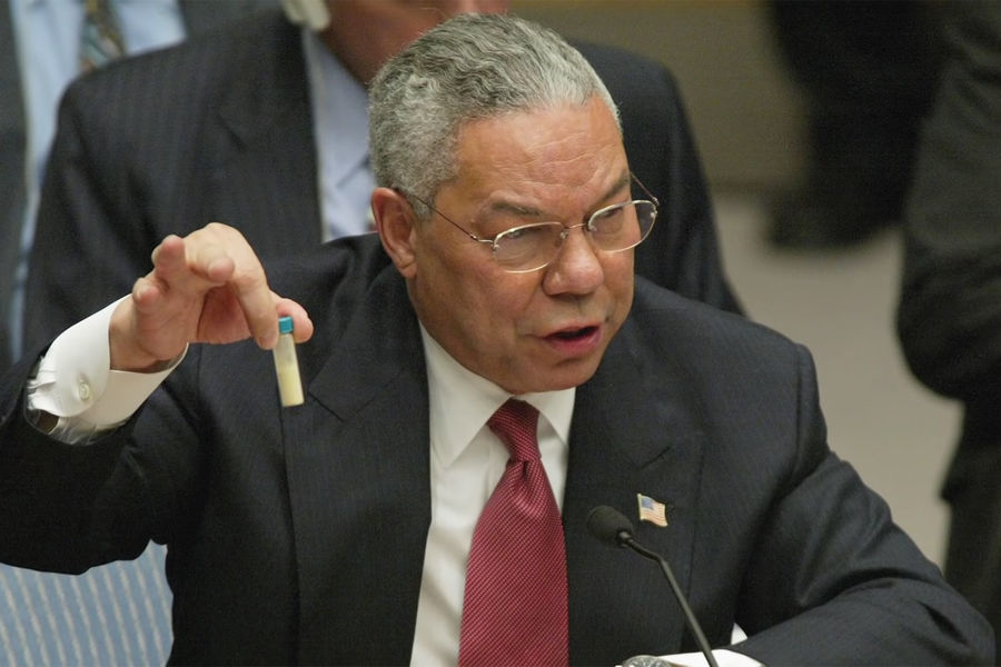 Тэрбээр 2003 онд Ирак руу Америкийн цэргүүдийг илгээх санал гаргасан гол хүмүүсийн нэг байсан бөгөөд Саддам Хуссейнд үй олноор устгах биологийн зэвсэг бий хэмээн баталж байв. НҮБ-ын Аюулгүйн зөвлөлийн хурал дээр Пауэлл Саддам Хуссейнд байгаа биологийн зэвсгийн дээж гэж баталсан цагаан өнгийн нунтаг бүхий шил үзүүлж байлаа. Хожим нь энэ нь хуурамч болох нь тогтоогдсон юм.
