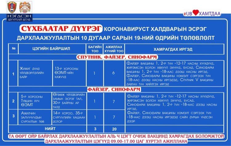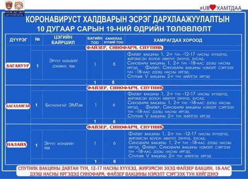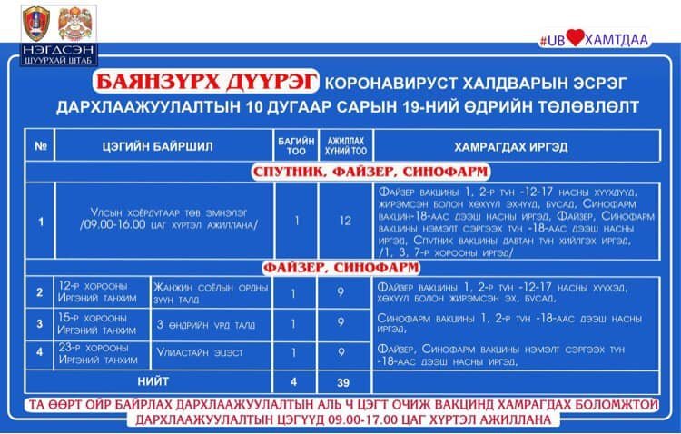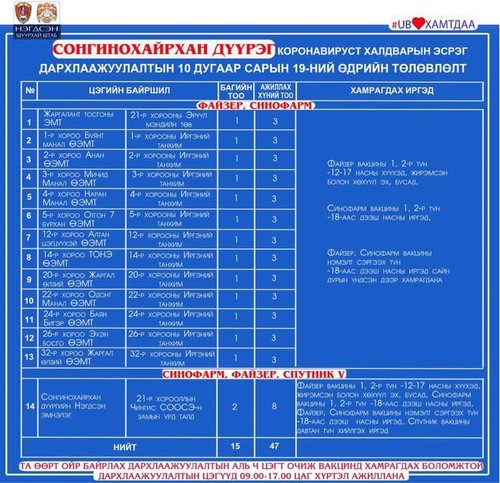 Өнөөдөр Улаанбаатар хотод явуулын 46 баг, суурин 35 цэгт 90 багийн 339 эмч, ажилтан ажиллаж, 5428 иргэнийг дархлаажуулахаар төлөвлөлөө. Та өөрт ойр вакцины аль ч цэгт очиж дархлаажуулалтад хамрагдах боломжтой. Дархлаажуулалтын цэгүүд 09:00-17:00 цаг хүртэл ажиллана. Дархлаажуулалтын цэгийг дүүрэг тус бүрээр танилцуулж байна.